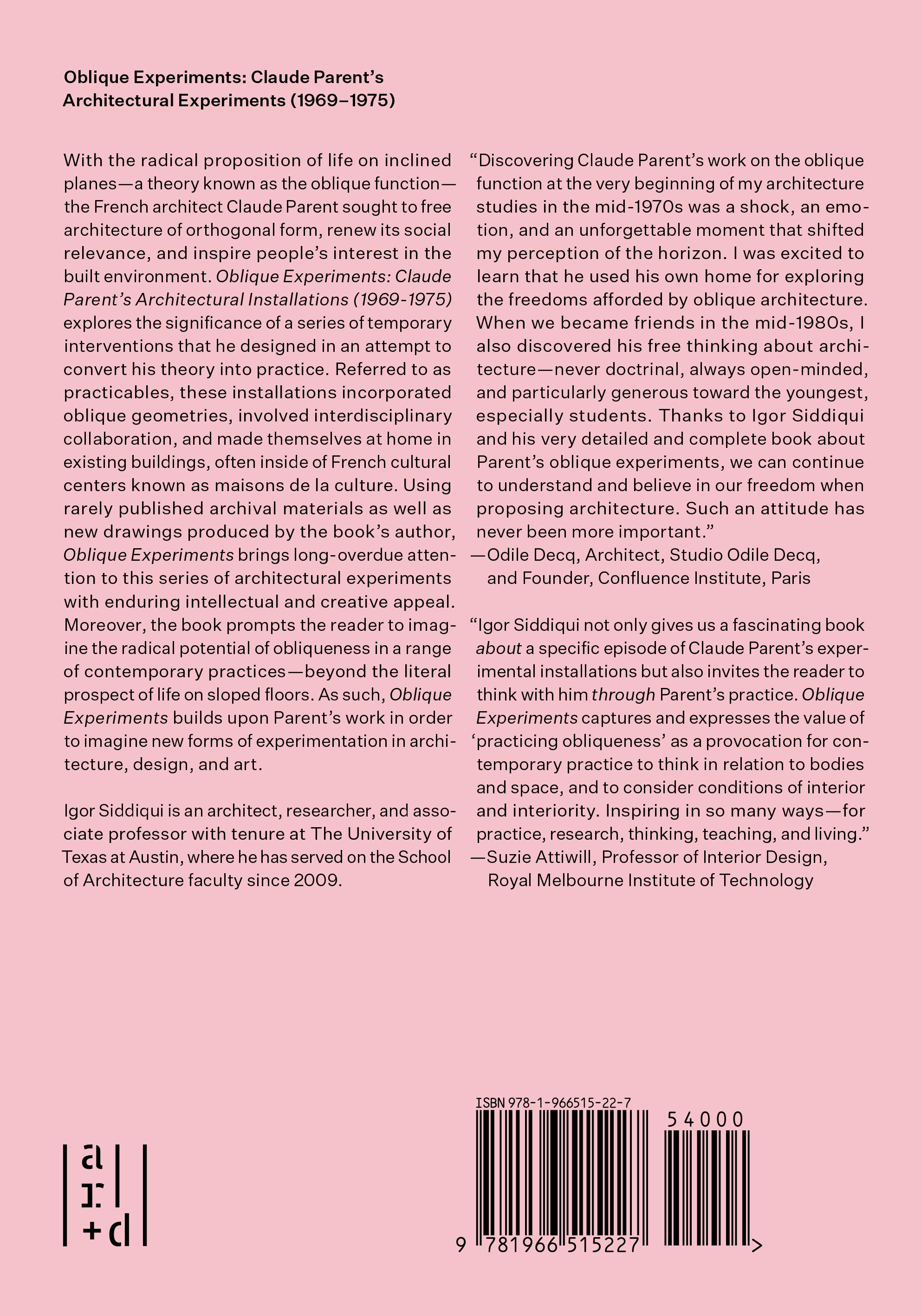 The purpose of this book is not to echo the architect’s advocacy for life on sloped ground, nor is it—as has already been done elsewhere—to perpetuate any particular predispositions related to architectural form or style. Instead, the intention here is to examine how the sum of this work serves as a model for a particular form of experimental practice that may be useful, as a matter of precedent, to contemporary designers. Written from an architect’s perspective, Oblique Experiments captures the intersection of visionary speculation and public engagement in Parent’s work that resonates with potential and excitement more than fifty years after its realization. By examining these acts of experimental architecture from a contemporary perspective, the book creates a space for two particular themes to unfold throughout its chapters. First is the role of interiority in these experiments, and second is the appropriation of an expanded definition of obliqueness as an approach to practice in and beyond architecture. In sum, therefore, the book treats Parent’s practicables as an iterative series of experiments rather than one-off projects; it brings out the underlying condition of interiority and presents it as an essential aspect of Parent’s work and a critical part of what makes the practicables experimental; and it considers obliqueness as more than either a formal architectural strategy or a literal prospect of life on slanted ground, whereby Parent’s experiments serve as a prompt for imagining and articulating other potential oblique orientations in contemporary practice.