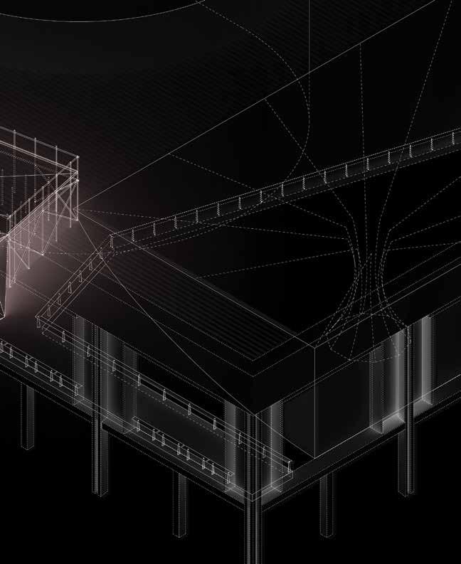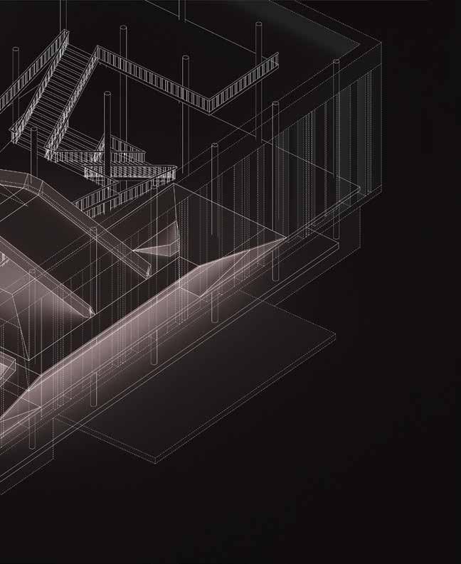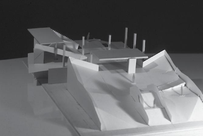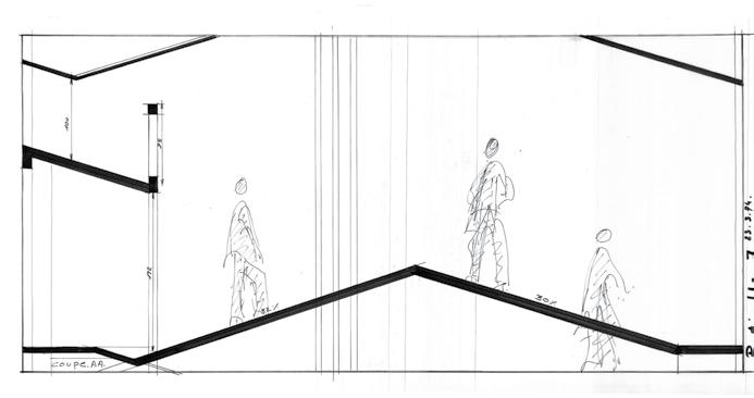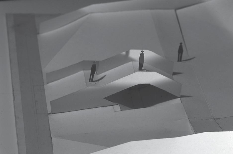 of slender columns in line with the load-bearing walls along the perimeter. The ceiling height was drawn at four meters in height, barely enough for a conventionally sized mezzanine but with enough flexibility for sloping the floor, as the scheme does, following a set of steep angles. To the left of the entrance, a small ramp slopes up toward a flat landing that extends the entire width of the room. From it, a large ramp with an incline of approximately twenty degrees slopes up toward the other end of the room. Another similarly angled and sized ramp stretches in the opposite direction, with