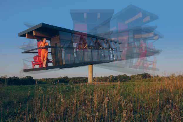 One such work, titled ReActor (2016), was a rectangular glass pavilion built in a rural field to be used as an experimental living unit for two people. Supported by only one center column, the structure hovered above the ground with Schweder occupying one side of it and his partner, the artist Ward Shelley, the other. Depending on how the two people moved in relation to one another, the pavilion tilted back and forth like a seesaw. ReActor can be compared to Parent and Virilio’s unbuilt gallery installation Instabilisateur pendulaire no. 1 in the way that it put the two artists on an elevated slope in relation to one another as part of a live-in experiment. Schweder and Shelley collaborated on other projects exploring similar balancing acts, which probe the intimate and codependent nature of one-on-one relationships. In another performance-based installation, My Turn (2018), the artists’ experimental habitat was a vertically oriented spinning wheel placed inside a gallery; an earlier version of it, Your Turn (2017) played out a similarly reciprocal dynamic along a two-sided climbing wall. However, it is perhaps Schweder’s ongoing solo series Performative Renovations that pushes his presence so close to the conceptual center of the work that the architect is not in but rather is the architecture itself, to paraphrase a term formulated by the architectural critic Germano Celant for referring to the radical architecture of the early
