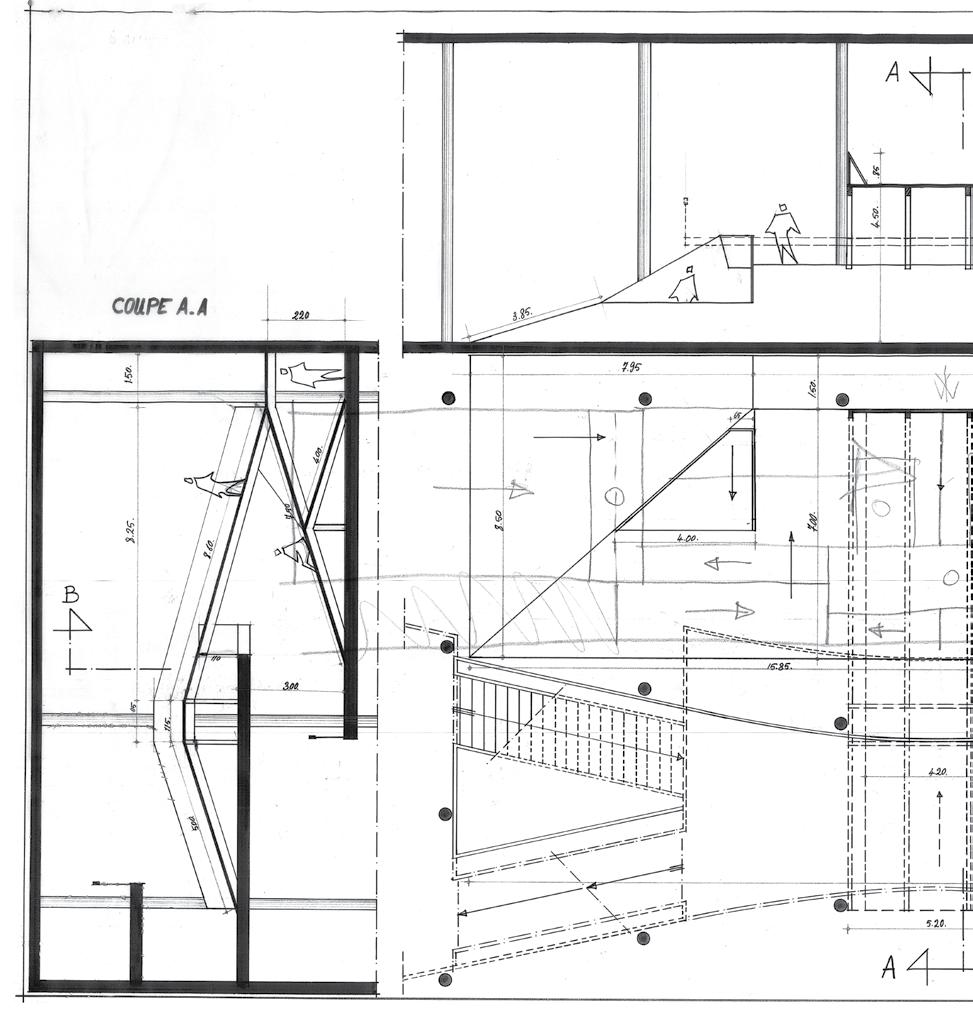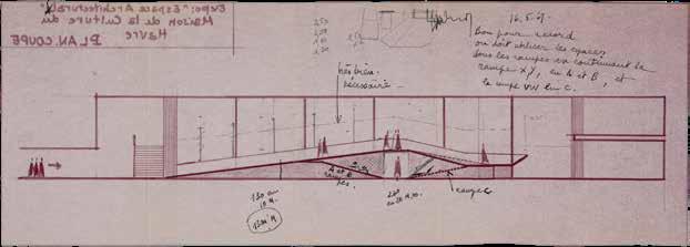 Floor plan drawing of the exhibition Espace architectural, with an overlay of freehand sketches. Section drawing of the Le Havre practicable shown inside the existing gallery, with handwritten annotations throughout.