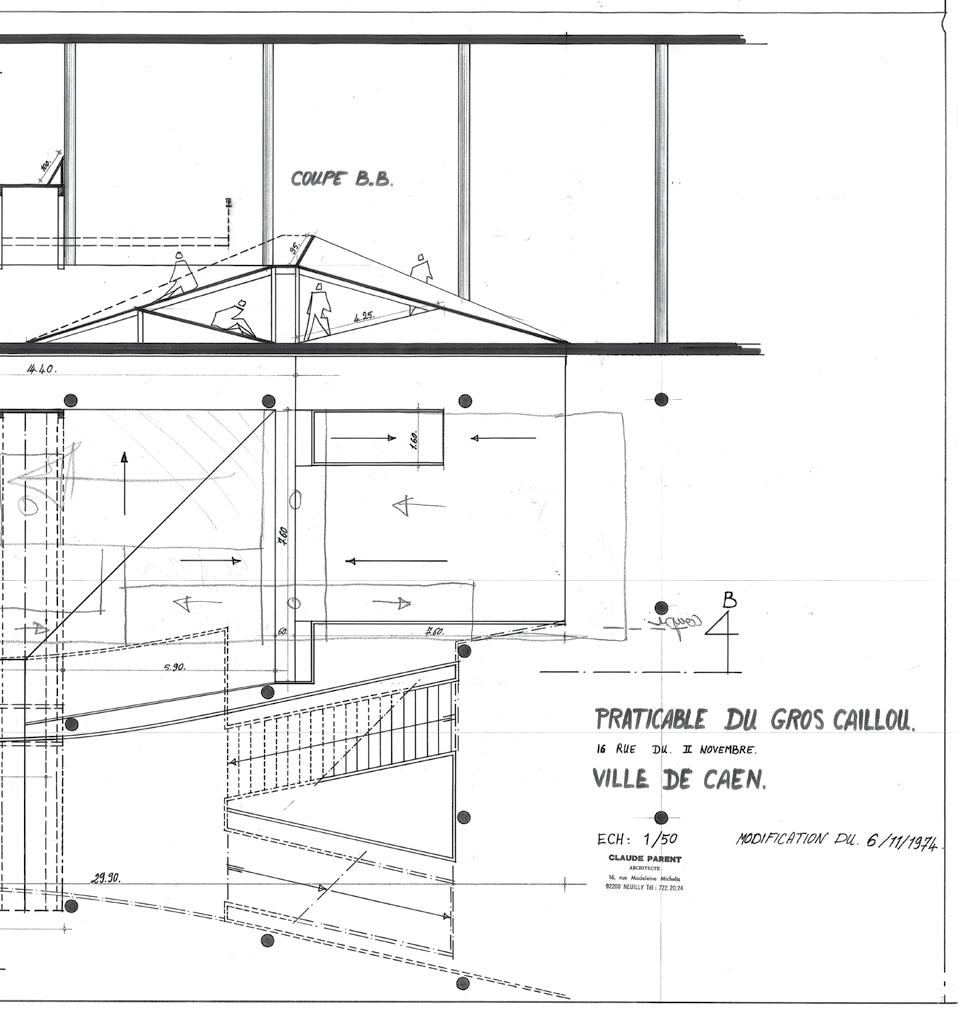 Two particular publications in the French language that are still in print cover more ground in this regard: the 2010 retrospective monograph Claude Parent: L’œuvre construite, l’œuvre graphique and the 2022 Claude Parent: Les desseins d’un architecte. Both offer comprehensive considerations of the architect’s entire career, including the period between the late 1960s and mid-1970s, when the practicable emerged as an important experimental device. The former is a catalog accompanying a major exhibition of the same name at the Cité de l’architecture et du patrimoine in Paris, a thorough and overdue overview of Parent’s entire career published