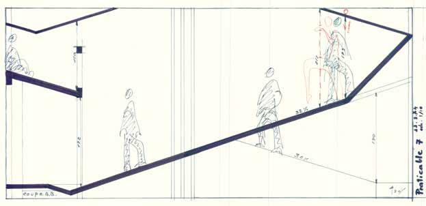 Sectional drawings of the design include loosely sketched figures of human bodies, inhabiting the slopes in a range of standing and seating postures. One such drawing shows multiple rows of seated figures on one slope, facing a single upright figure—drawn as if performing in a dance-like manner rather than standing still—on the opposite side. Meanwhile, the spaces underneath each incline are also populated by outlines of bodies, conveying a sense of simultaneity among the activities occurring within a single space. Other sectional drawings likewise show figures walking along the inclined paths as well as sitting inside various cocoon-like nooks. Even though it is relatively compact, the presence of multiple figures suggests that this interior was intended to be used for a range of group activities. Dimensional notations imply that, unlike the sloped interior of the children’s library in Mâcon, this space was sized for adult bodies.