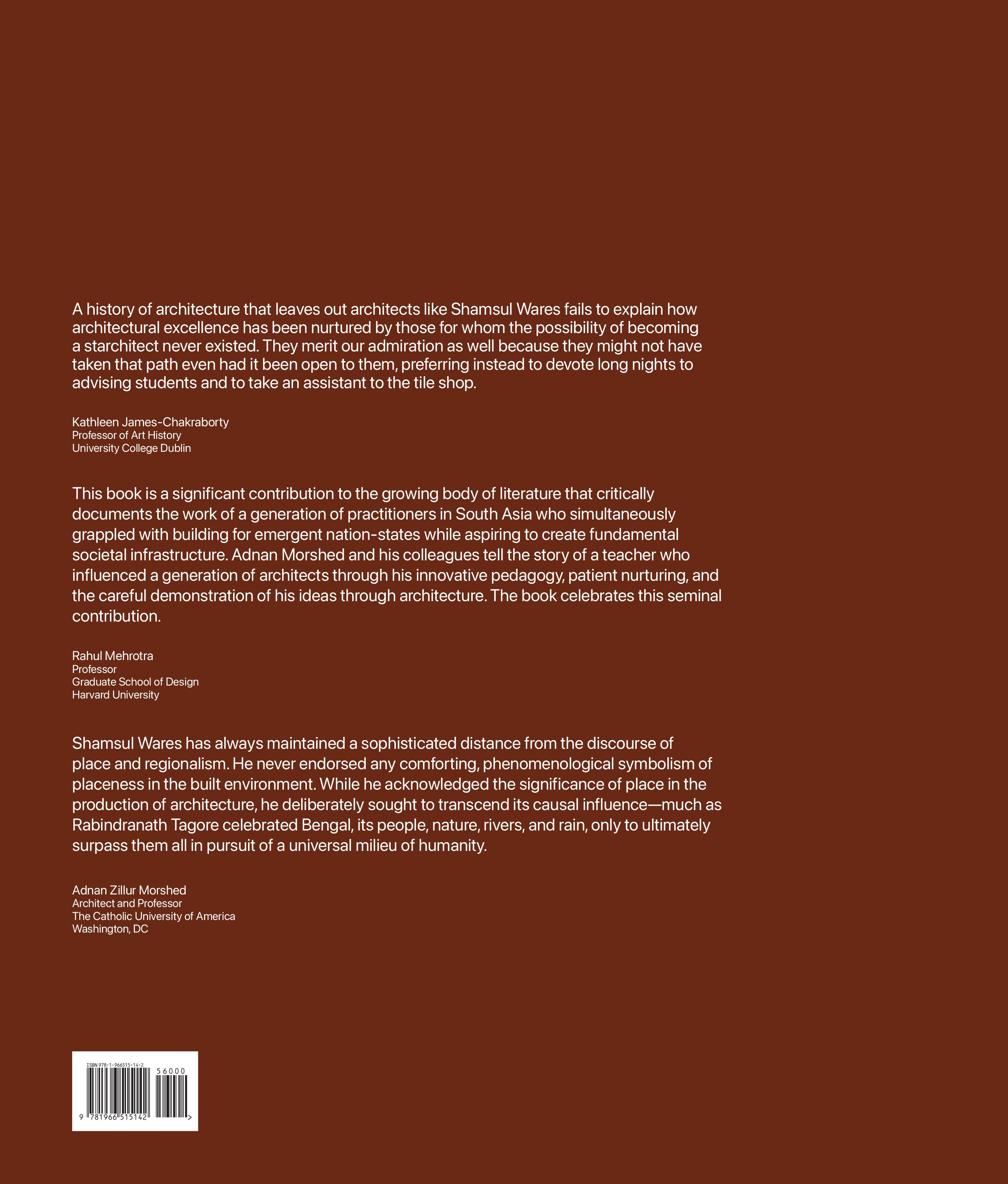 Almost every architecture school has one or two exceptional teachers. They stand out because of their dedication to their students but also because of their brilliance in training them to understand how lines on a sheet of paper, or more recently digital code, can anticipate walls and enclosures that shape space and experience in ways that transcend the everyday. This book is full of such lines on paper, lines drawn by Bangladeshi architect Shamsul Wares, lines that anticipated buildings, most in the capital city of Dhaka, erected between the mid-1970s and the early twenty-first century. The buildings offer more than a hint of why Wares is such a respected architect in his own country and why his work deserves to be better known internationally. In this volume’s illustrations, I quickly recognized what anyone who has had the privilege of meeting him admires, which is his passionate belief in how carefully considered architecture can enrich the lives of those who encounter it. The twinkle in the eye, the shock of white hair, and the gift for adda, constitute charm, but those who have shared Wares’s company, even if, as I have, only for a snippet of a movie and the length of a conference, quickly sense the wisdom that underpins his disarming demeanor.