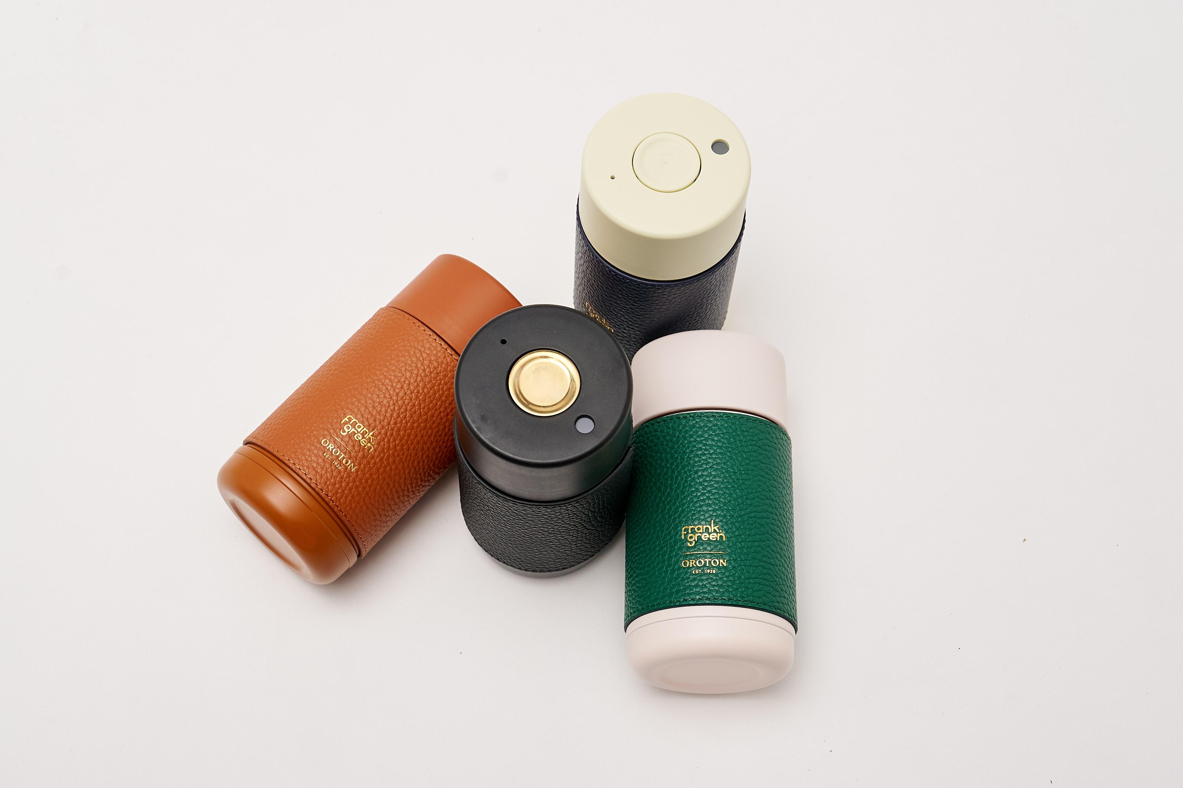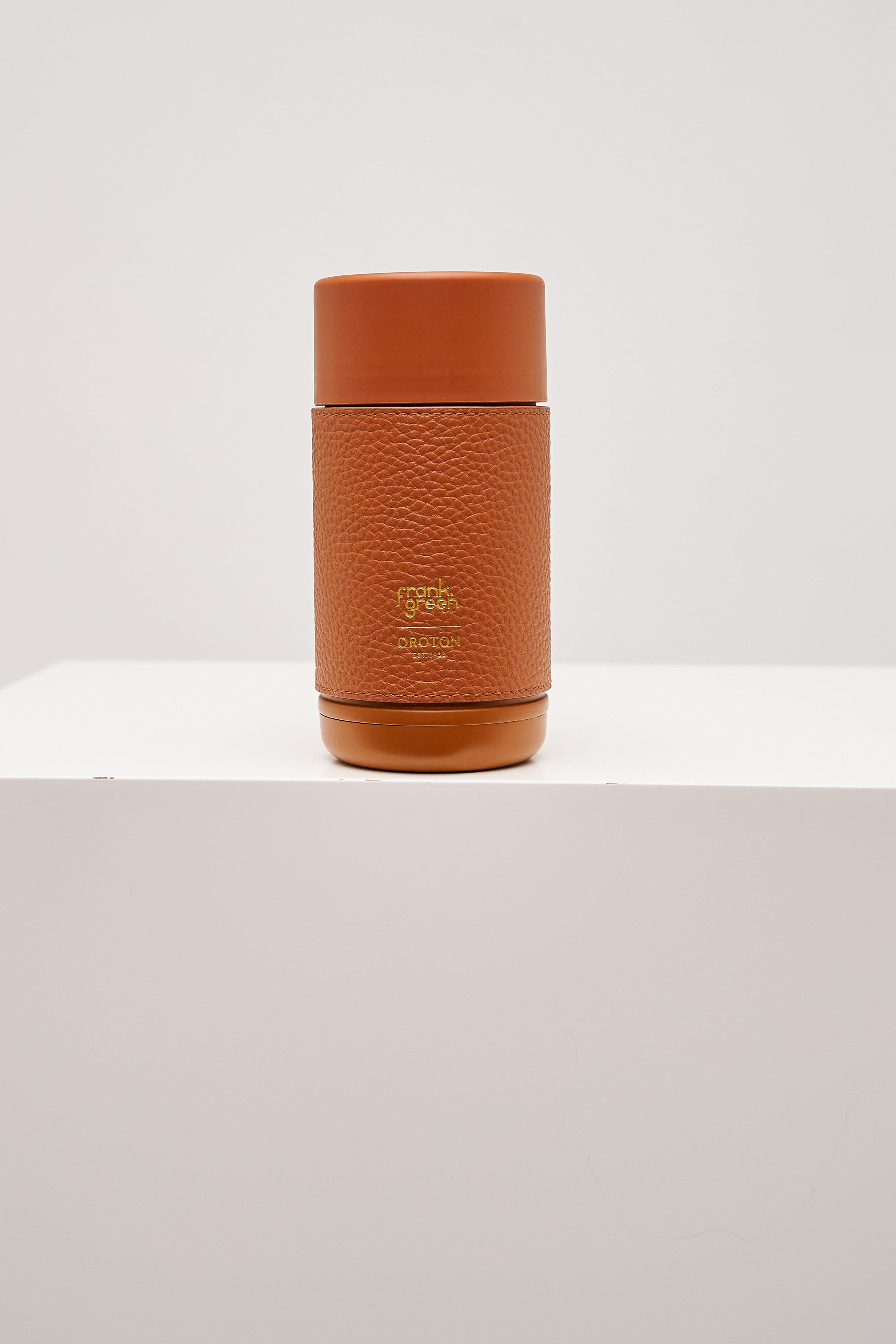 FRANK GREEN 355ML CUP WITH OROTON LEATHER WRAP. AVAILABLE IN NORTH EA, BLACK, AMBER & TUDIO GREEN