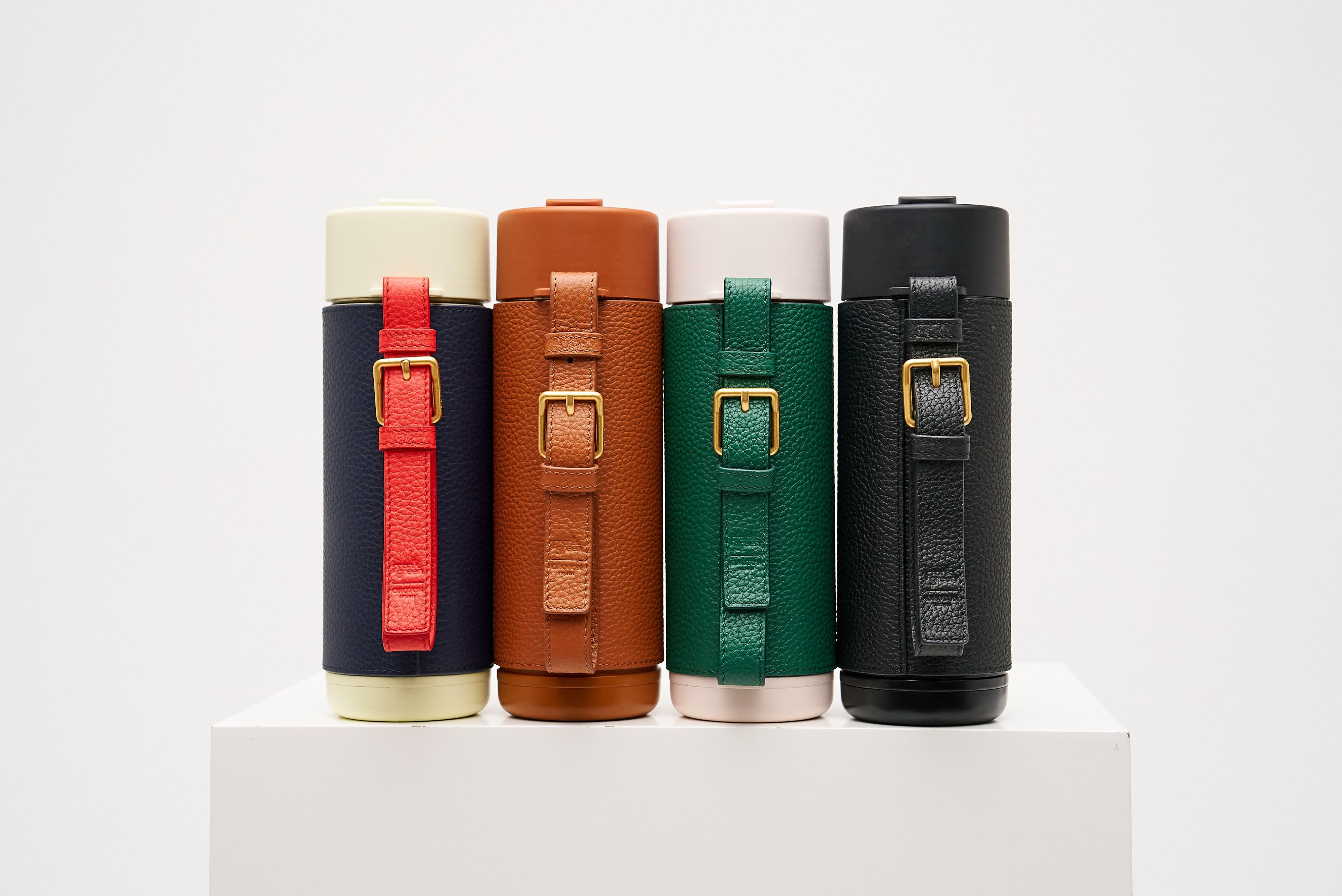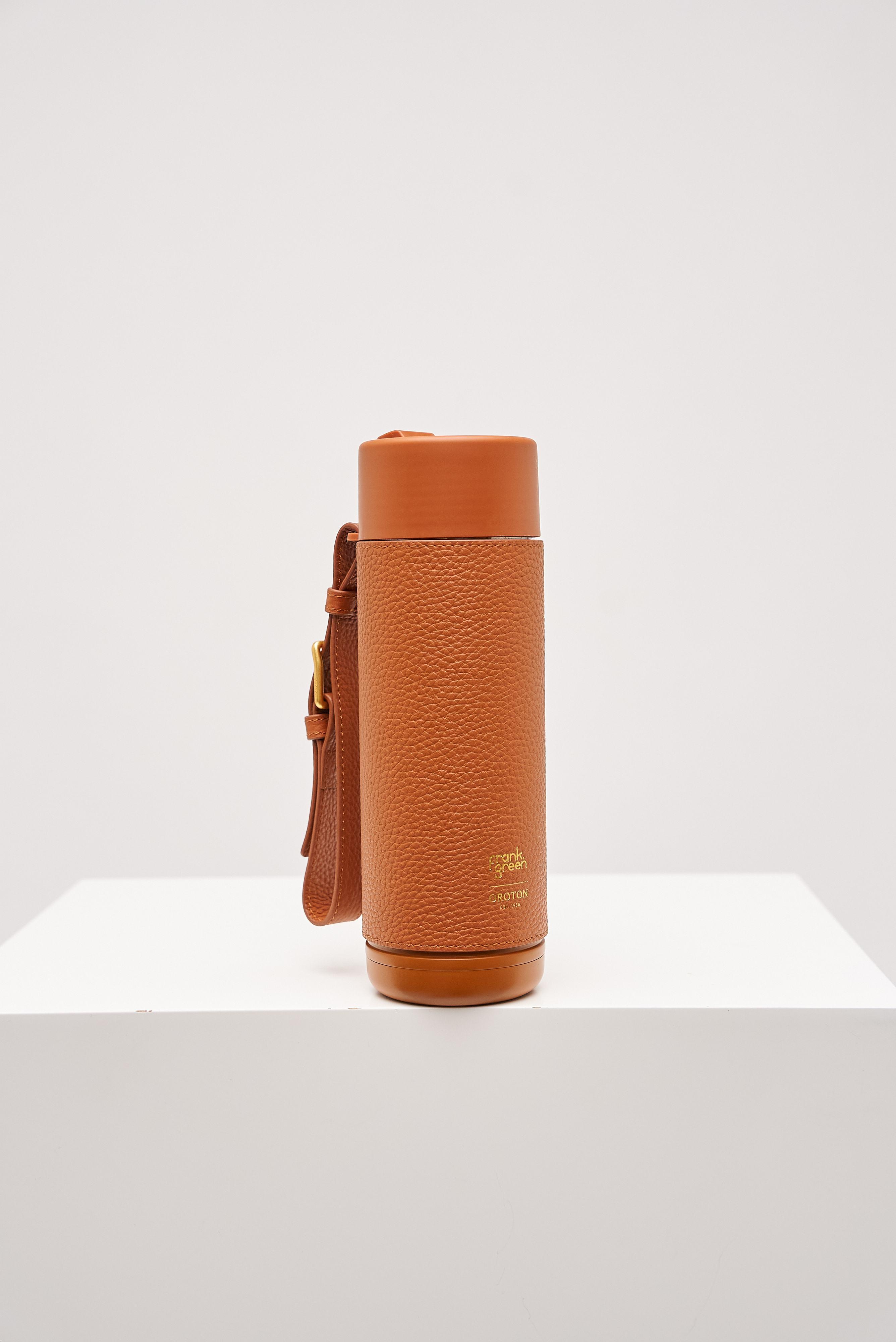 FRANK GREEN 595ML BOTTLE WITH OROTON LEATHER WRAP & WRI TLET. AVAILABLE IN NORTH EA, AMBER, TUDIO GREEN & BLACK