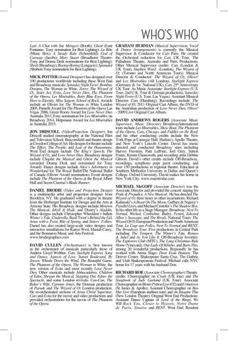 MICK POTTER (Sound Designer) has designed over 100 productions worldwide including these West End and Broadway musicals: Saturday Night Fever, Bombay Dreams, The Woman in White, Zorro, The Wizard of Oz, Sister Act, Evita, Love Never Dies, The Phantom of the Opera, Les Misérables, Betty Blue Eyes, From Here to Eternity, Miss Saigon, School of Rock. Awards include an Olivier for The Woman in White London 2005, Parnelli Award for The Phantom of the Opera Las Vegas 2006, Green Room Award for Love Never Dies Australia 2011,Tony nomination for Les Misérables on Broadway 2014, Helpmann Award for Les Misérables DAVID ANDREWS ROGERS (Associate Music in Australia 2015. Supervisor, Music Director) Broadway/international tours include Les Misérables, Show Boat, The Phantom JON DRISCOLL (Video/Projection Designer) Jon of the Opera, Cats, Chicago, and Fiddler on the Roof; Driscoll studied cinematography at the National Film and his other conducting credits include the New and Television School, Beaconsfield and theatre design York Pops at Carnegie Hall, Harlem’s Apollo Theatre, at Croydon College of Art. His designs for theatre include and New York’s Lincoln Center. David has music The Effect, The People, and Last of the Haussmans. directed and conducted Broadway stars including West End designs include The King’s Speech, The Harvey Fierstein, Patti LuPone, Joel Grey, Sutton Wizard of Oz, and Love Never Dies. Broadway designs Foster, Kristin Chenoweth, and recording artist Debbie include Chaplin the Musical and Ghost the Musical Gibson. David’s other credits include Off-Broadway, (awarded Drama Desk and nominated for Tony recordings, symphony pops guest conducting, and Award). Dance designs include Alice’s Adventures in over 150 productions in regional theatre. Educated at Wonderland for The Royal Ballet/The National Ballet Southern Methodist University in Dallas and Queen’s of Canada (Olivier Award nomination). Event designs College, Oxford University, David makes his home in include The Phantom of the Opera at the Royal Albert New York City. www.maestrodar.com Hall and Secret Cinema’s Blade Runner. MICHAEL McGOFF (Associate Director) was the DANIEL BRODIE (Video and Projection Design) Associate Director and provided the concert staging for is a multimedia artist and projection designer from Pride & Prejudice, A New Musical. He has directed The Brooklyn, NY. He graduated with a degree in theatre Wizard of Oz three times in other incarnations, Richard from the Herberger Institute for Design and the Arts at Kalinoski’s A Beast On The Moon, Gaffney & Najimy’s Arizona State. His Broadway designs include Motown Parallel Lives, and Michael Cristofer’s The Shadow Box. The Musical, Jekyll & Hyde, and Disney’s Aladdin. In his other life as a Stage Manager- Broadway: Next To Other designs include Christopher Wheeldon’s ballets Normal, Wicked, Cymbeline, Butley, Festen, Edward Winter’s Tale, Cinderella, Basil Twist’s Behind the Lid, Albee’s Seascape, and The Rivals. National Tours: The Arias with a Twist, Rite of Spring, and Sisters’ Follies. Wizard Of Oz European Production and North American Daniel has also created large-scale video designs and Tour, La Cage aux Folles, Next To Normal and RENT, interactive installations for Kanye West, Mariah Carey, The Broadway Tour. Five productions in Central Park and the Bonnaroo Music and Arts Festival. including The Tempest, The Winter’s Tale, Romeo www.brodiegraphics.com & Juliet and As You Like It. Off-Broadway favorites: The Explorers Club (MTC), The Long Christmas Ride DAVID CULLEN (Orchestrator) is best known Home (Vineyard), Our Lady Of Kibeho, and Burn This, as the orchestrator of musicals particularly those of among 20 wonderful productions. Regionally he has Andrew Lloyd Webber- Cats, Starlight Express, Song worked with Arena Stage- Dear Evan Hansen, The and Dance, Aspects of Love, Sunset Boulevard, By Denver Center, Shakespeare Santa Cruz, The Guthrie Jeeves, Whistle Down the Wind, The Beautiful Game, and Utah Shakespearean Festival. Michael calls NYC The Phantom of the Opera, The Woman in White, the home for 17 years with his husband Don. new version of Evita and most recently Love Never Dies. Other musicals include Abbacadabra, Children RICHARD ROE (Associate Choreographer) Theatre of Eden, Shogun the Musical, Stepping Out, Edna- the credits: Choreographer on Crush (UK tour) and The Spectacle, and some London revivals- Can-Can, The Songbook of Judy Garland (UK Tour); Associate Baker’s Wife, Carmen Jones, the Donmar production Choreographer on Monty Python Live (O2) and Urinetown of Parade and The Wizard of Oz London production. (St James & Apollo); Assistant Choreographer on Ben He re-orchestrated sections of Jesus Christ Superstar, Hur Live (European stadium tour) and on Imagine This Cats and Evita for the movie and video productions and (New London Theatre). Original West End Productions: provided orchestrations for the movie of The Phantom Assistant Dance Captain of Lord of the Rings, We of the Opera. Will Rock You, Closer to Heaven, Notre Dame de Paris, Sinatra and RENT. West End: Resident