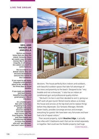 NEIL AND WENDY ON ANGUILLA Before you invest, know that you love the island. Honestly, there are easier ways to make money! But if you love Anguilla, it will always be a place you want to come home to. We love that it is a British island, they are the best destinations (secure/low crime) in the Caribbean. If you want to get away, Anguilla is the perfect place to be, whether it’s for three days or three months. If you want uncrowded, laid-back luxury, beautiful beaches and great people – this is the place. It’s a hidden gem. But with more ways of getting here, more people will come, discover and fall in love with Anguilla. New resorts like The Four Seasons, The Reef and Zemi Beach are introducing the island to more new people who will “get the bug” and won’t want to leave!
