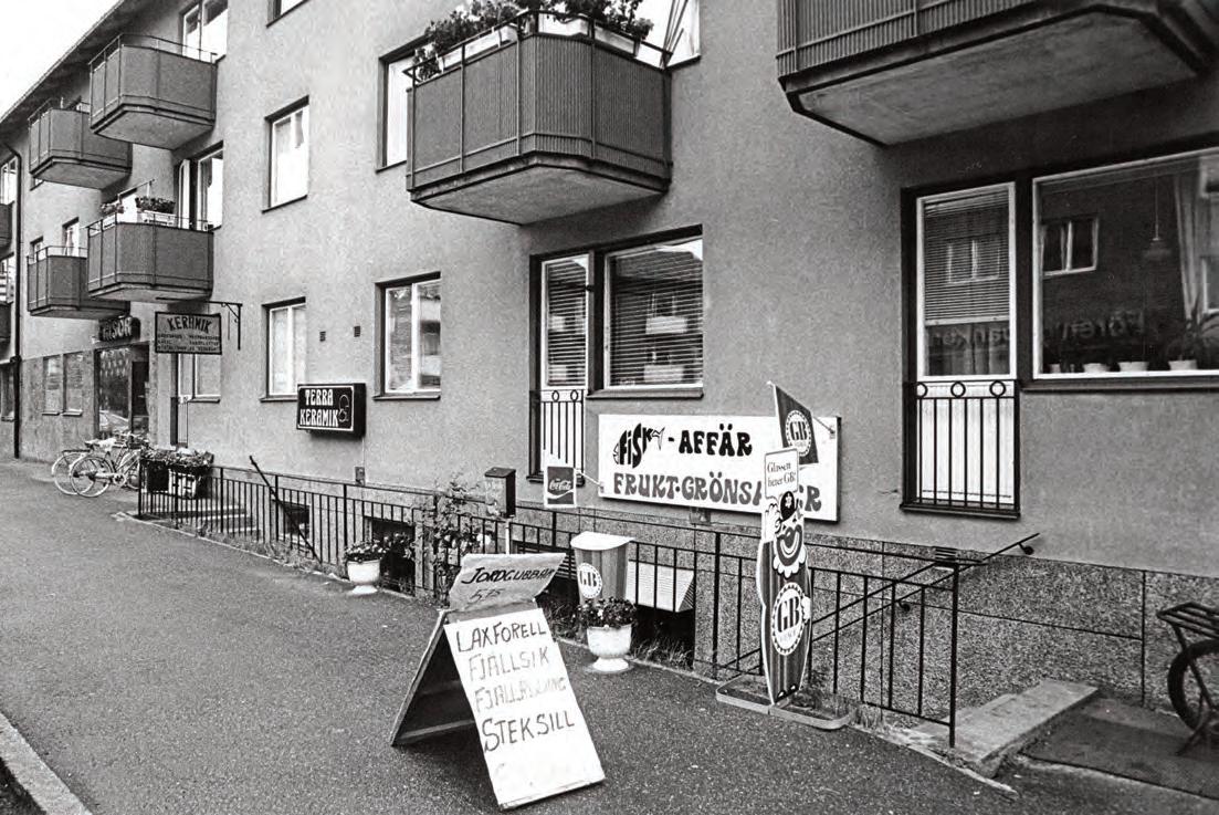 1980. I dessa källarlokaler låg en fiskaffär och en keramikaffär (Terra keramik). Videobutiken Helikon låg här senare innan den flyttade in i August Larsson-huset. Foto: Åsa Lindkvist Ax.