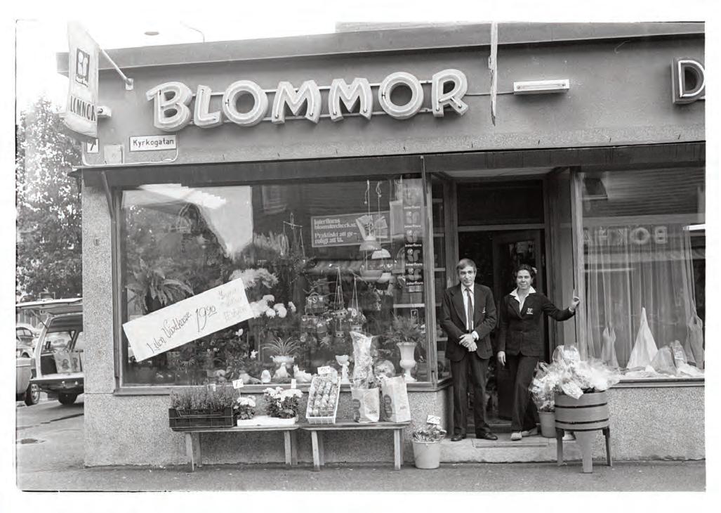 Levenius Blommor i hörnet av Dalagatan och Kyrkogatan. På trappen står