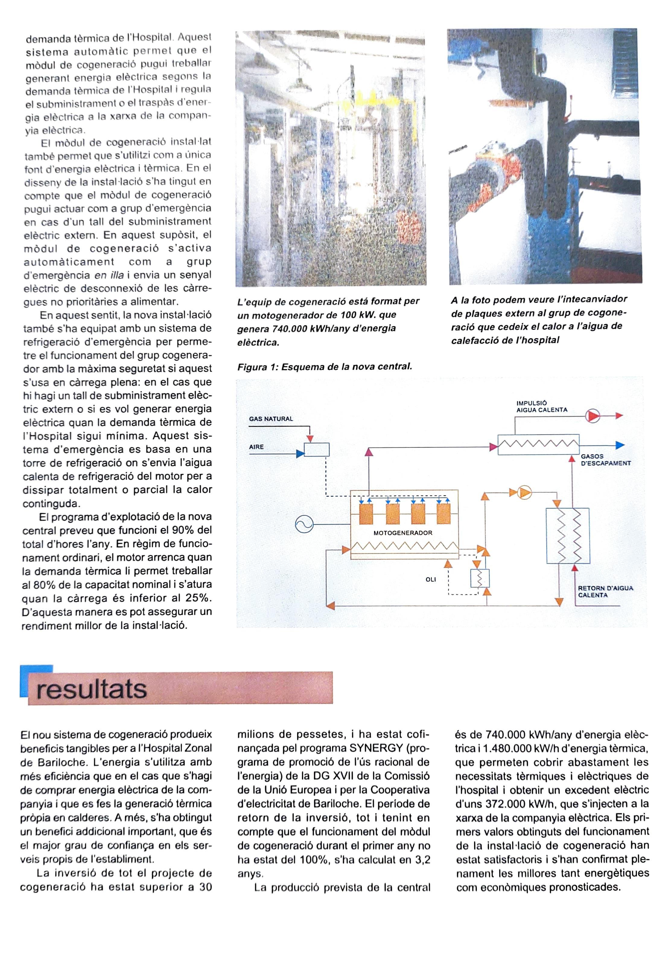 és de 740.000 kWh/any d'energia elèctrica i 1.480.000 kW/hd'energia tèrmica, que permeten cobrir abastament les necessitats tèrmiques i elèctriques de I'hospital i obtenir un excedent elèctric d'uns 372.000 kW/h, que s'injecten a la xarxa de la companyia elèctrica. Els primers valors obtinguts del funcionament de la instal lació de cogeneració han estat satisfactoris i s'han confirmat plenament les millores tant energètiques com econòmiques pronosticades. anys La producció prevista de la central