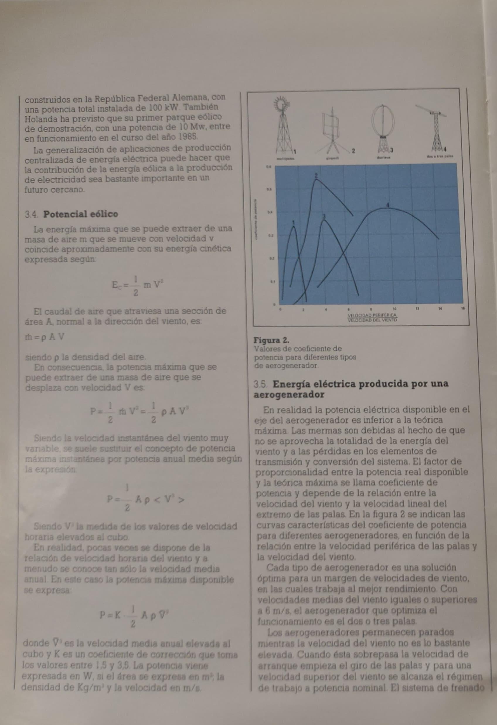En realidad la potencia eléctrica disponible en el eje del aerogenerador es inferiora la teórica máxima. Las mermas son debidas al hecho de que no se aprovecha la totalidad de la energía del viento y a las pérdidas en los elementos de transmisión y conversión del sistema. El factor de proporcionalidad entre la potencia real disponible y la teórica máxima se llama coeficiente de potencia y depende de la relación entre la velocidad del viento y la velocidad lineal del extremo de las palas. En la figura 2 se indican las Curvas caracteristicas del coeficiente de potenci1a para diferentes aerogeneradores, en función de la relación entre la velocidad periférica de las palas y la velocidad del viento.