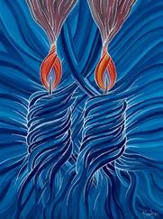 I'm from London, and I live in Jerusalem now. Meaning: It’s the Shabbat candles. I painted them like trees with strong roots, with bright flames. All the lines coming in from the side forming the candles, is like the energy we put in towards Shabbat from the week.
