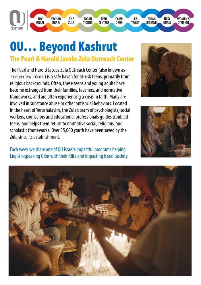 Seymour J. Abrams • Orthodox Union Jerusalem World Center • Avrom Silver Jerusalem College for Adults • Wolinetz Family Shul • Makom BaLev • Birthright • Yachad • NCSY in Israel • JLIC in Israel • Camp Dror • Pearl & Harold M. Jacobs ZULA Outreach Center • The Jack Gindi Oraita Program • OU Israel Kashrut