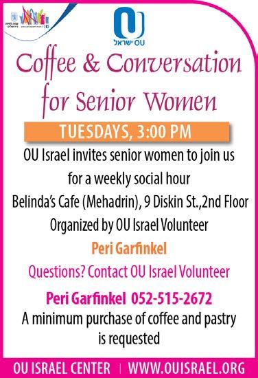 in the Pelech Girls school – 31 Yehuda St., Baka but ONLY by prior registration and payment