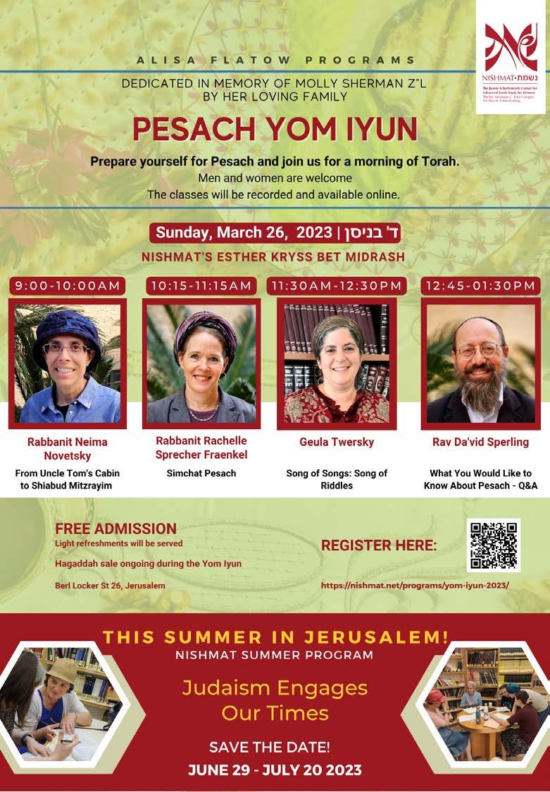 in the Pelech Girls school – 31 Yehuda St., Baka but ONLY by prior registration and payment