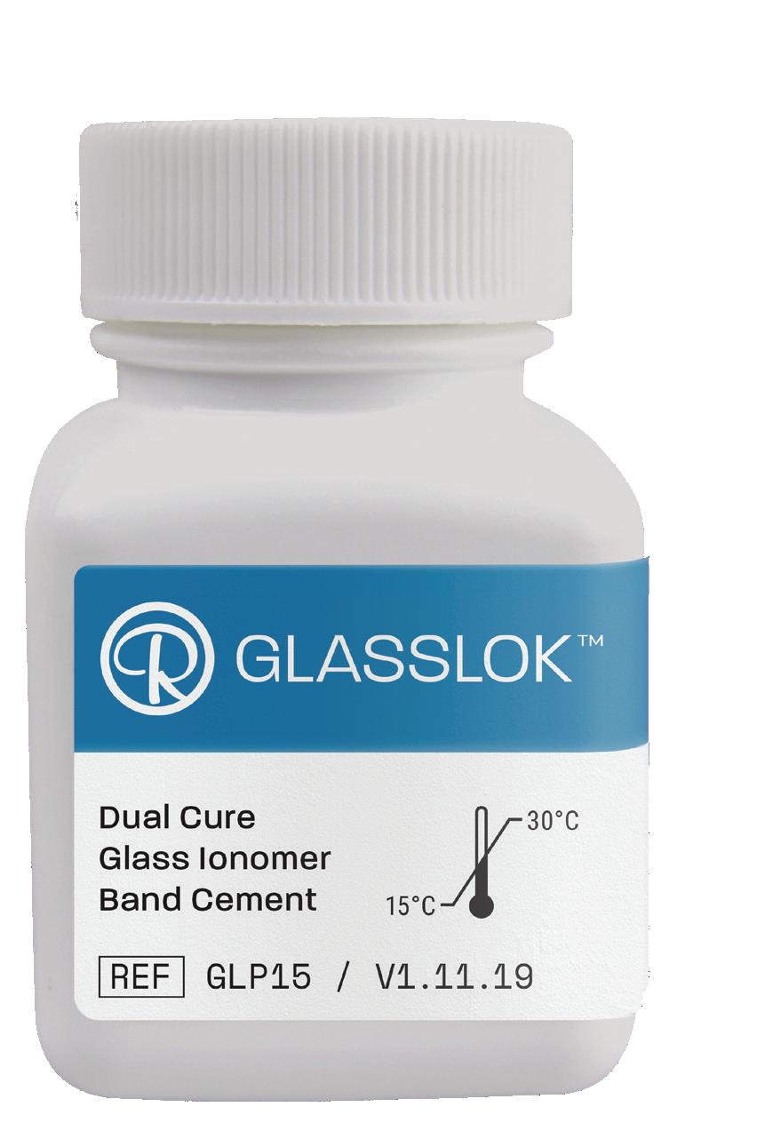 Dual Cure Glass Ionomer Band Cement. Hydrophilic Powder /Liquid Cement. Ciment de verre ionomère à polymérisation double pour bague. Poudre hydrophile/colle liquide.