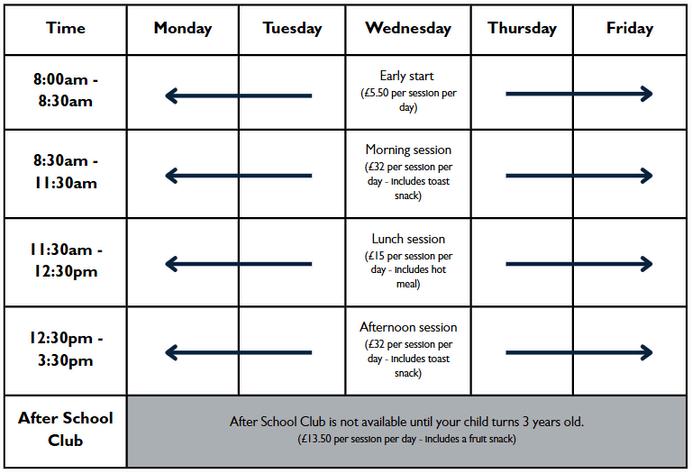 Any combinations of sessions can be booked across the week with a minimum weekly commitment of 3 full days or 6 sessions