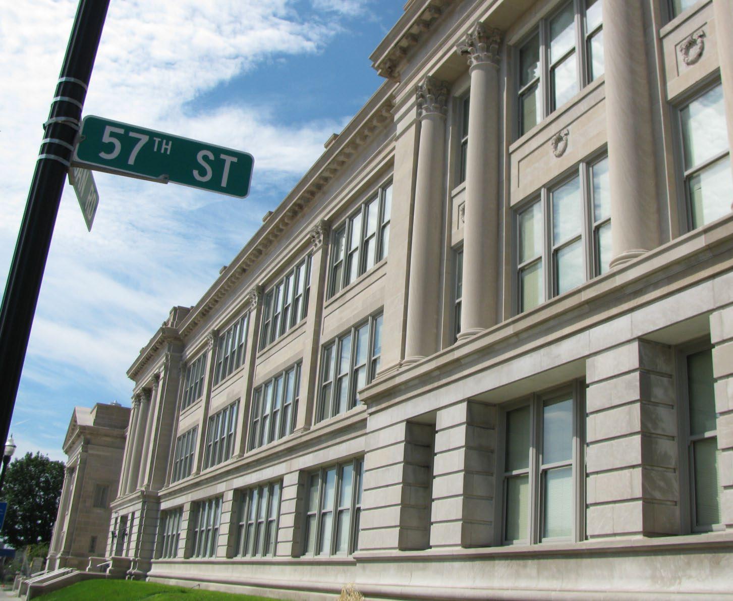Walter Reuther Central High School is part of the Kenosha Civic Center National Historic District developed during the “City Beautiful Movement.” This neoclassical high school was designed with exterior walls of Bedford (Indiana) Limestone in 1925 by architect John Chubb.