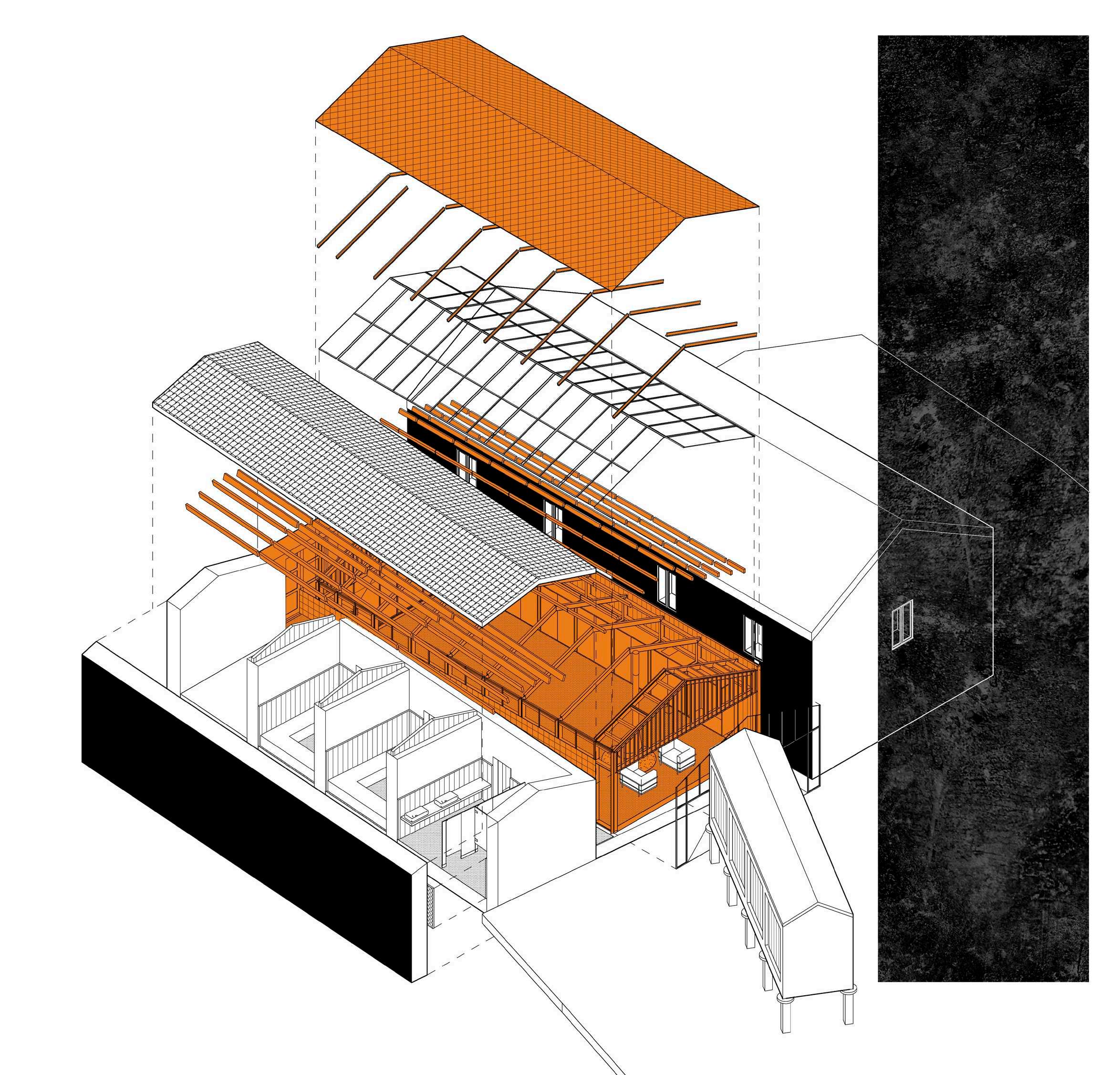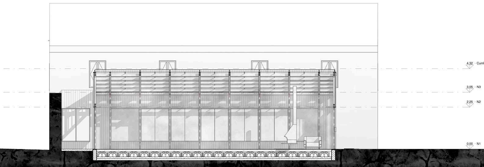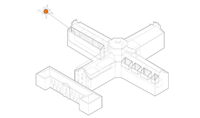 In the courtyard positioned between the rectory and a ruined volume, we build a lightweight building that envelopes the courtyard with a glass enclosure. This allows for visual transparency and maximum light penetration. We aim to avoid competition with the existing stone structures. The gable roof, also composed of glass, harmonizes with the neighboring buildings and is fitted with a metal mesh to filter sunlight. Consequently, a versatile space emerges, fulfilling the community’s need for a gathering and social area