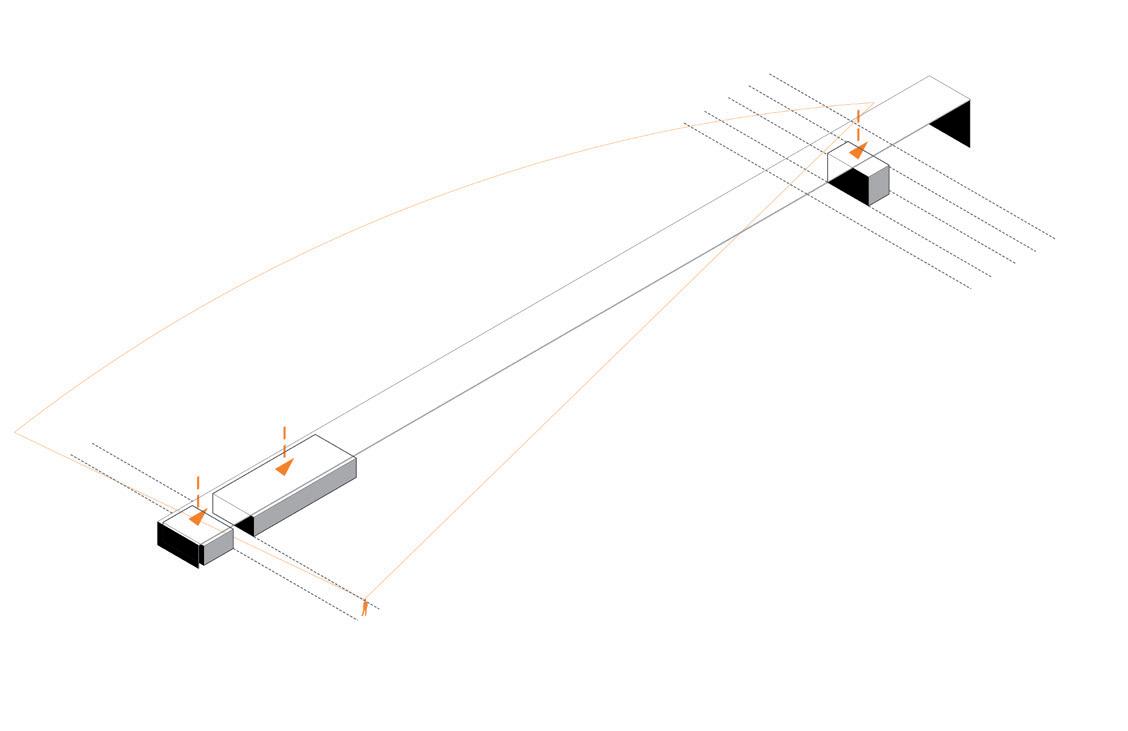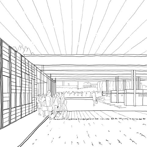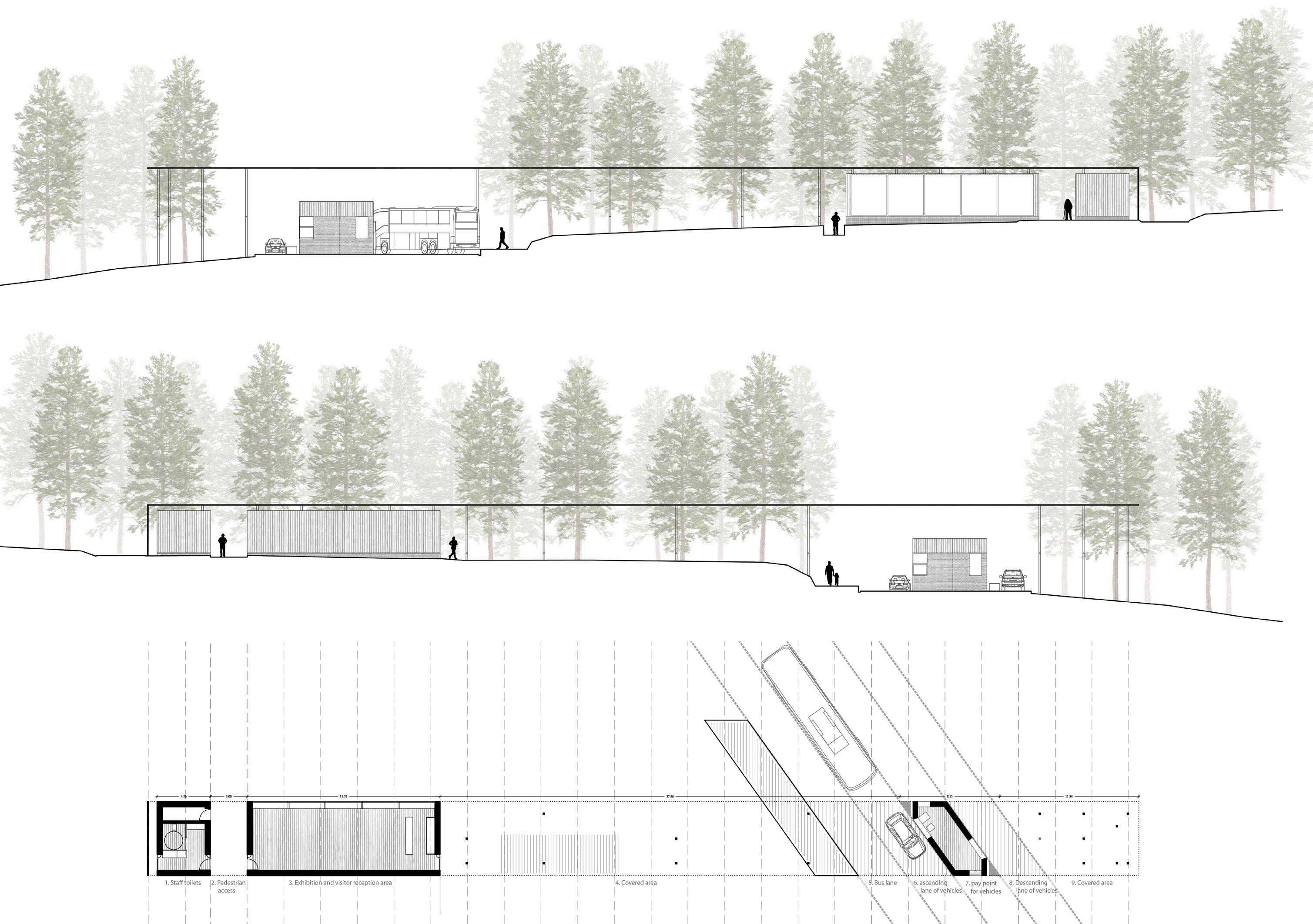 2| Exhibition and information volume, and vehicle pay point volume, connected by the pergola.