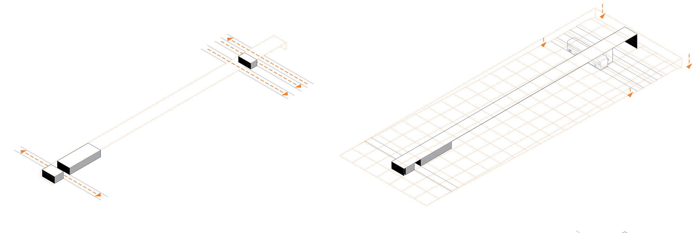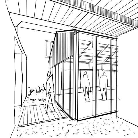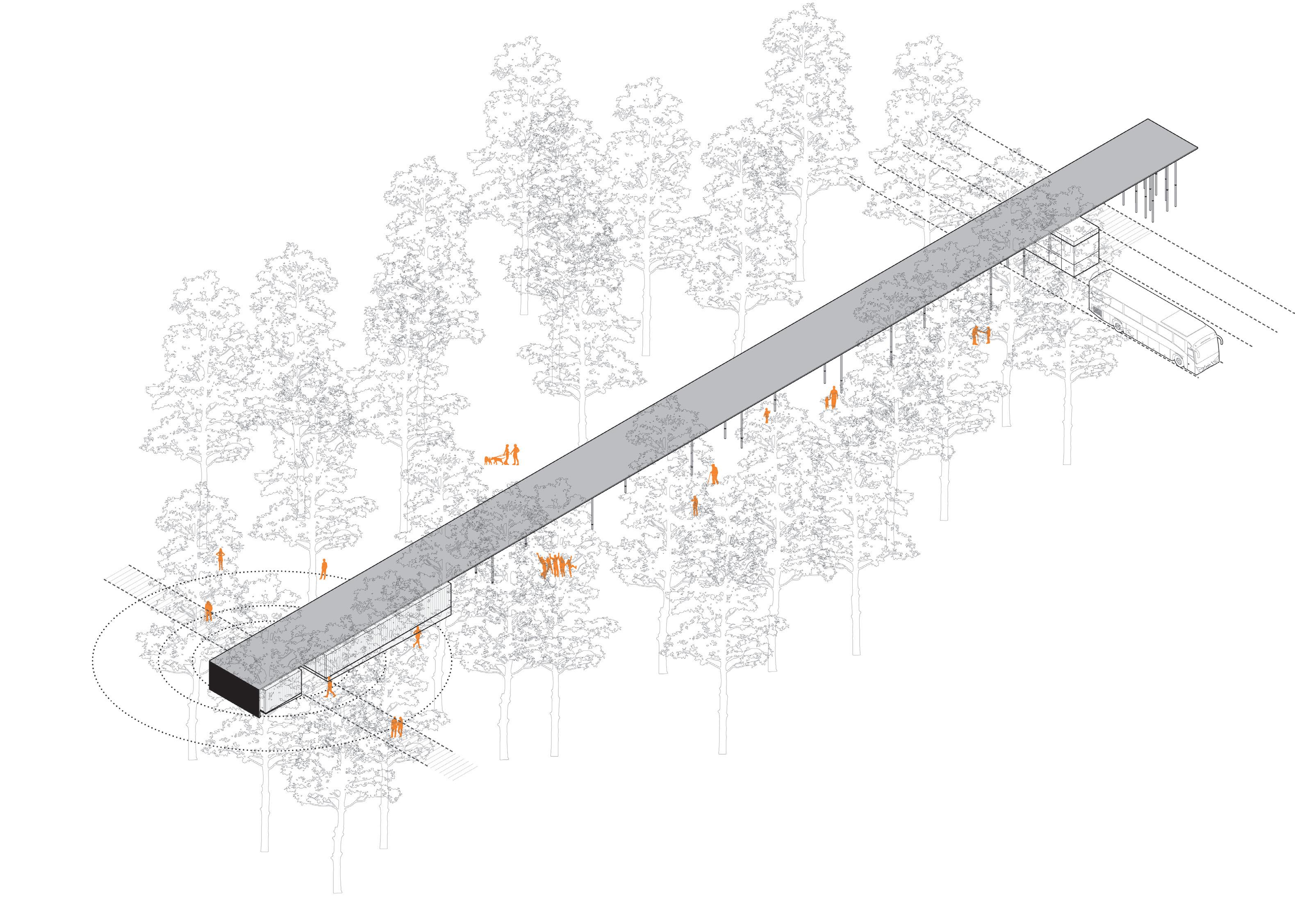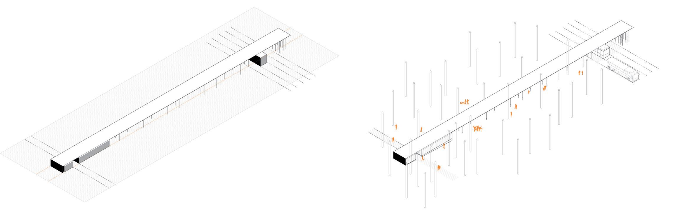 3| Pedestrian and vehicle zones. The larger volume is divided into two sections and houses the toilets.
