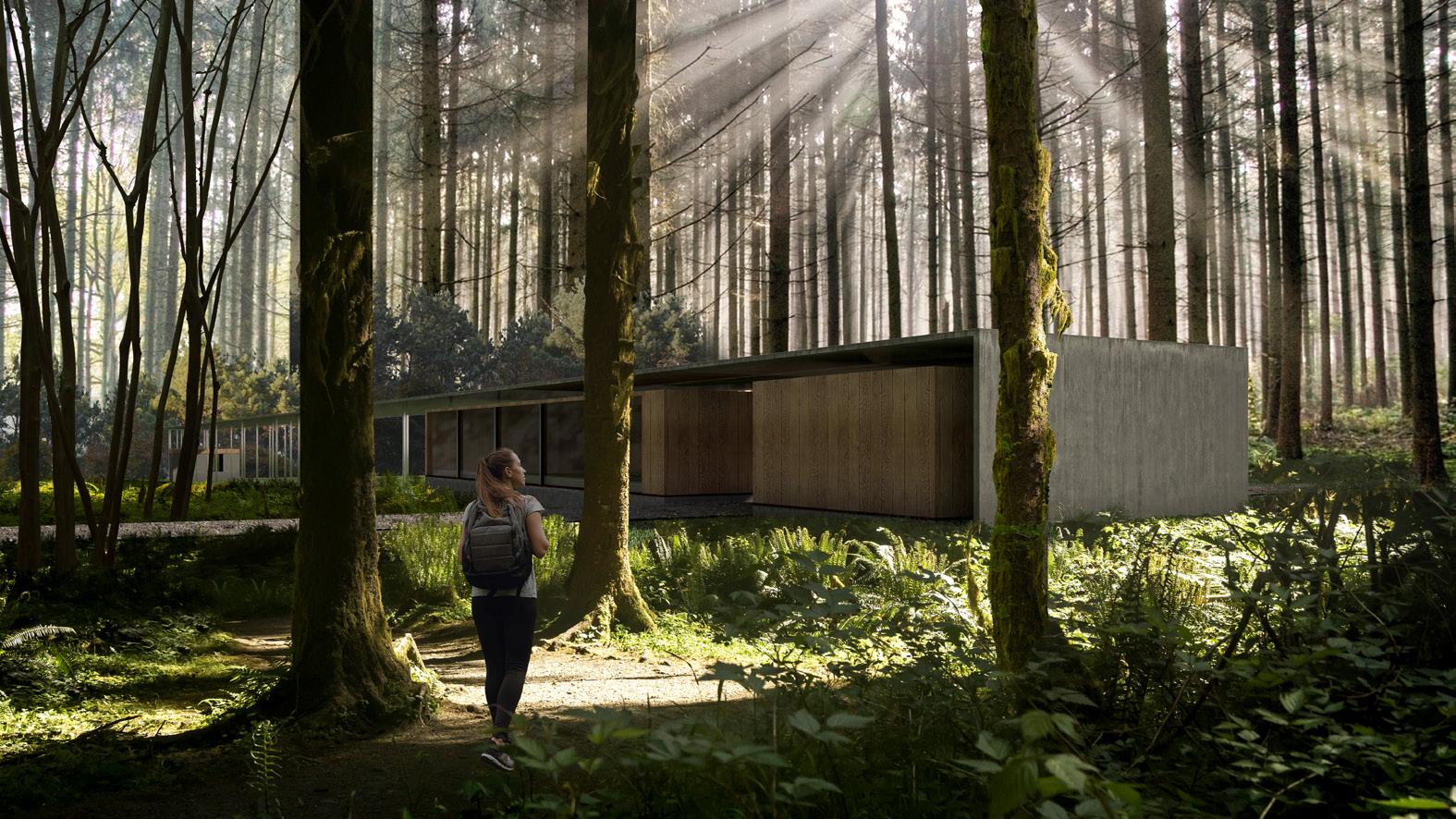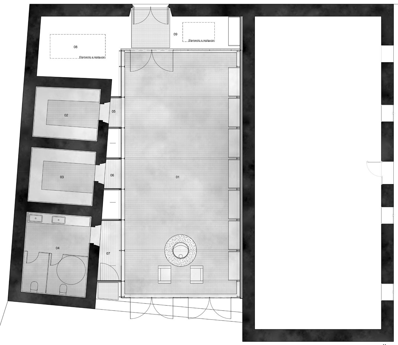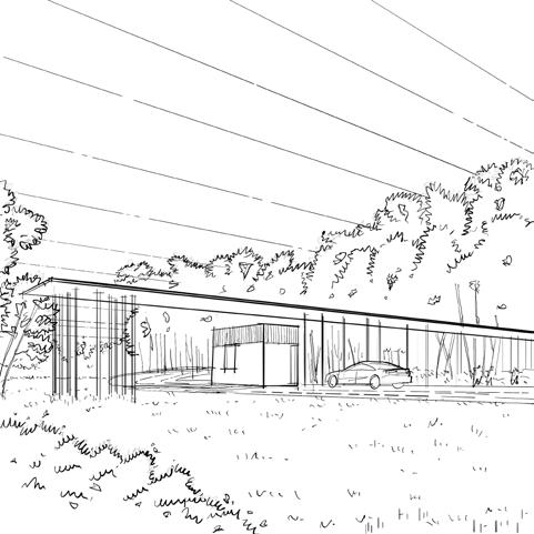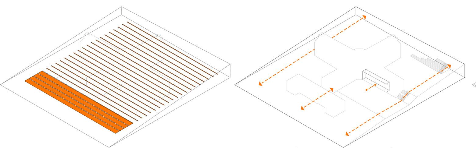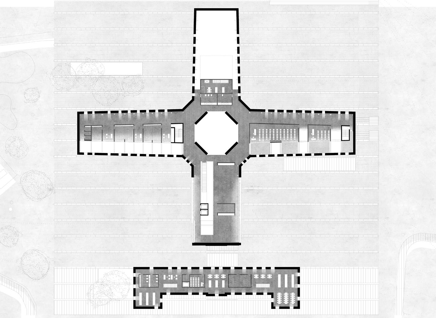 3| Pedestrian and vehicle zones. The larger volume is divided into two sections and houses the toilets.