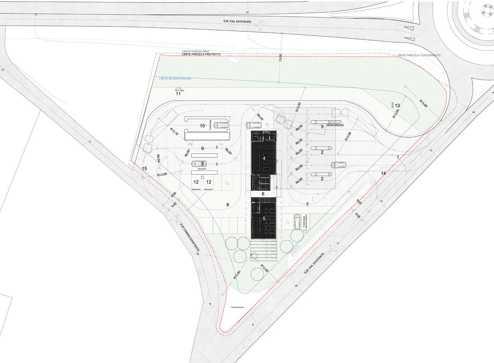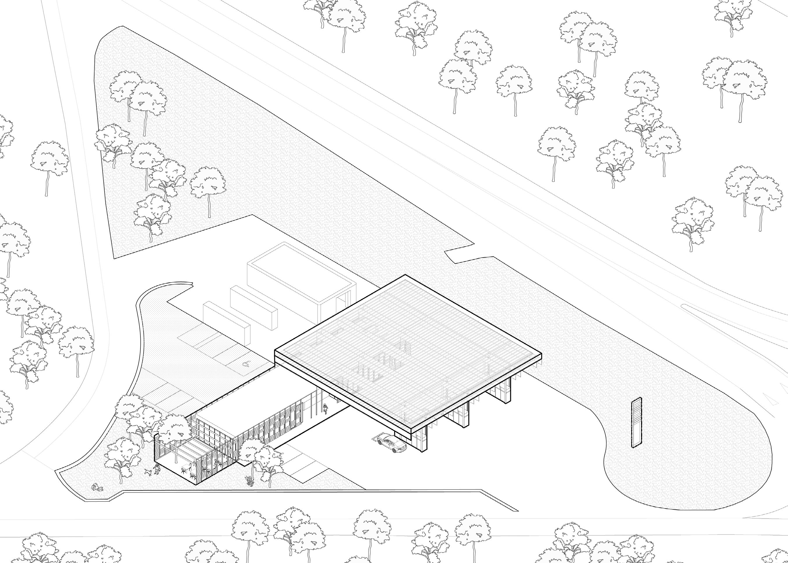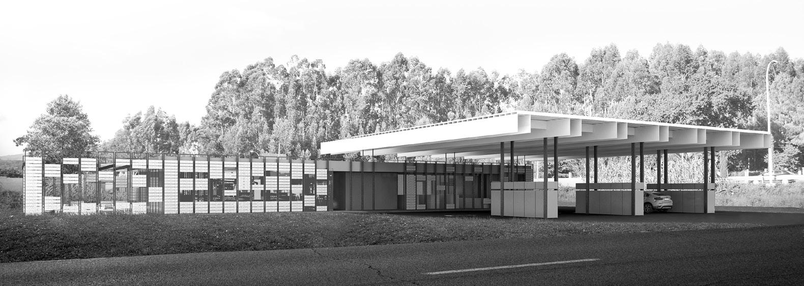A volume divides the plot into two distinct zones: one for supplies and another for parking and washing area. The building comprises a spacious pergola with an open metal structure and a volume accommodating the shop and restaurant.