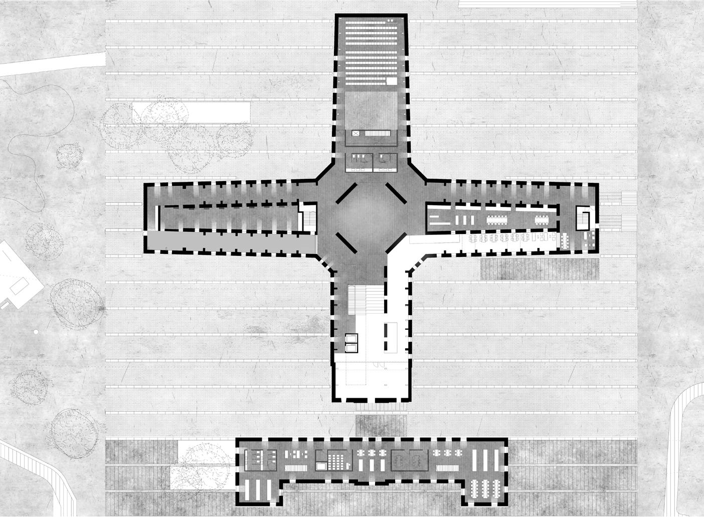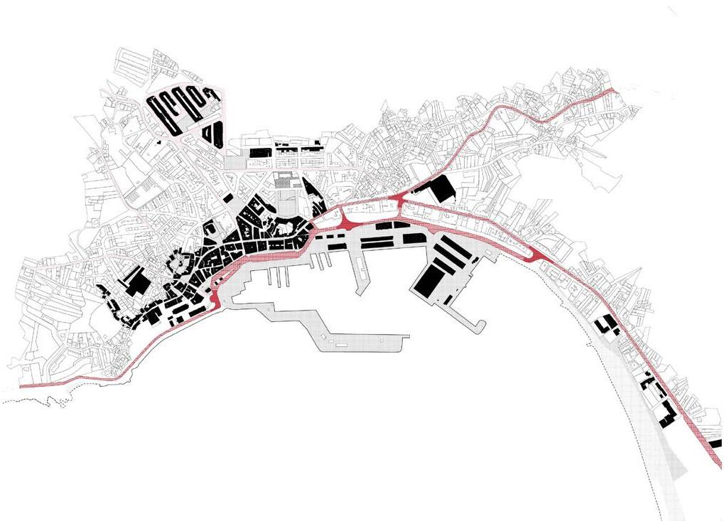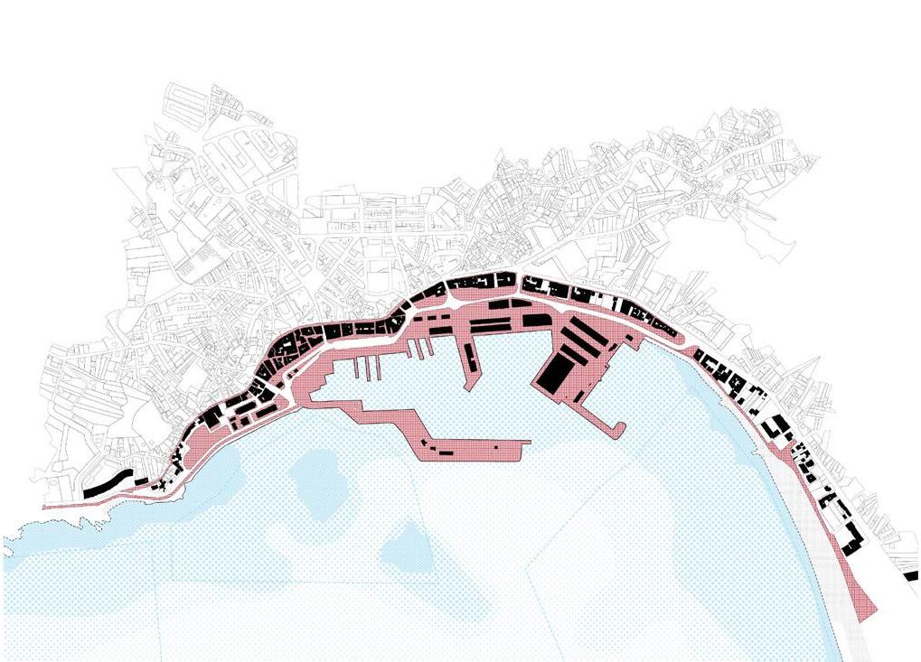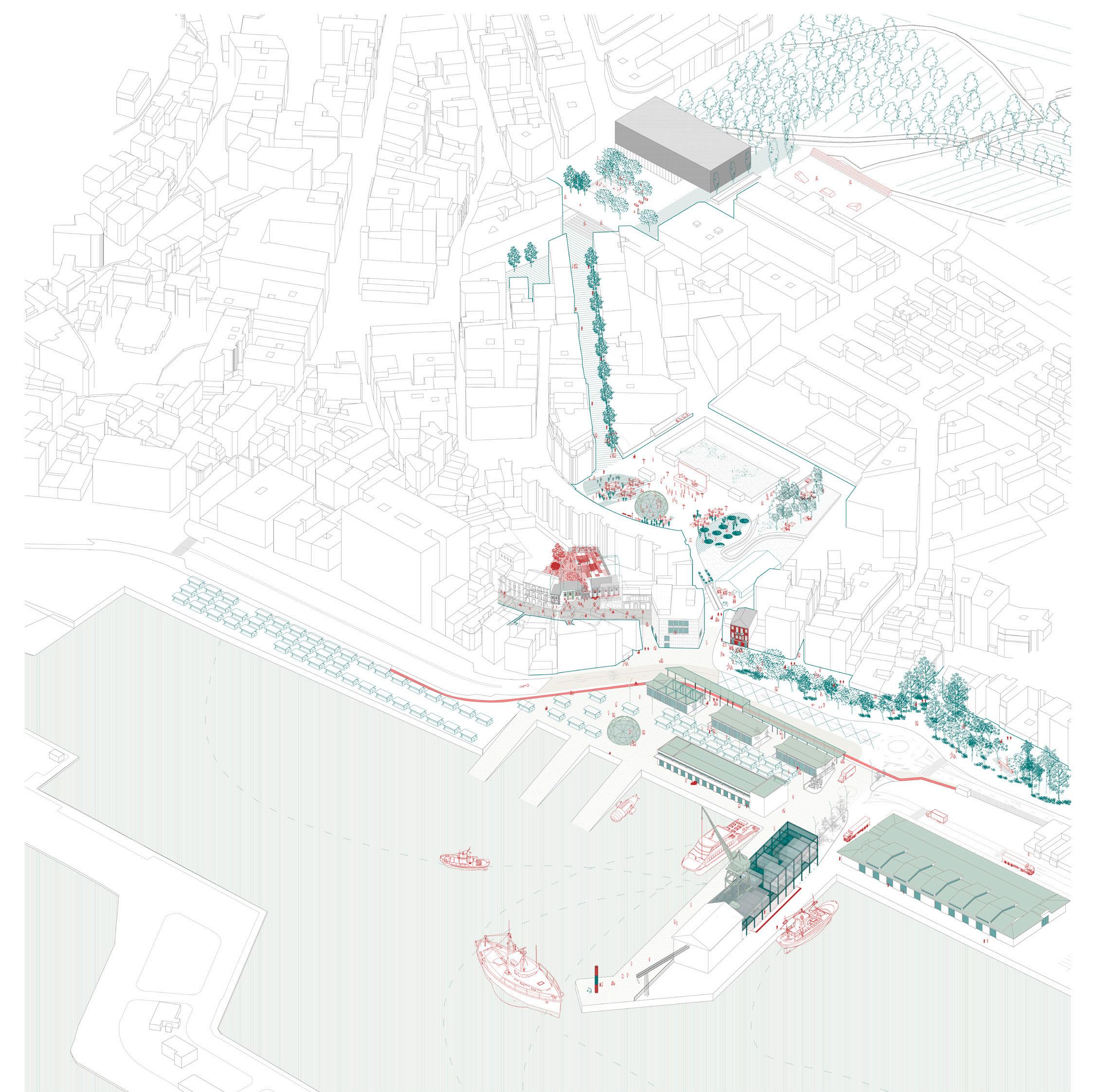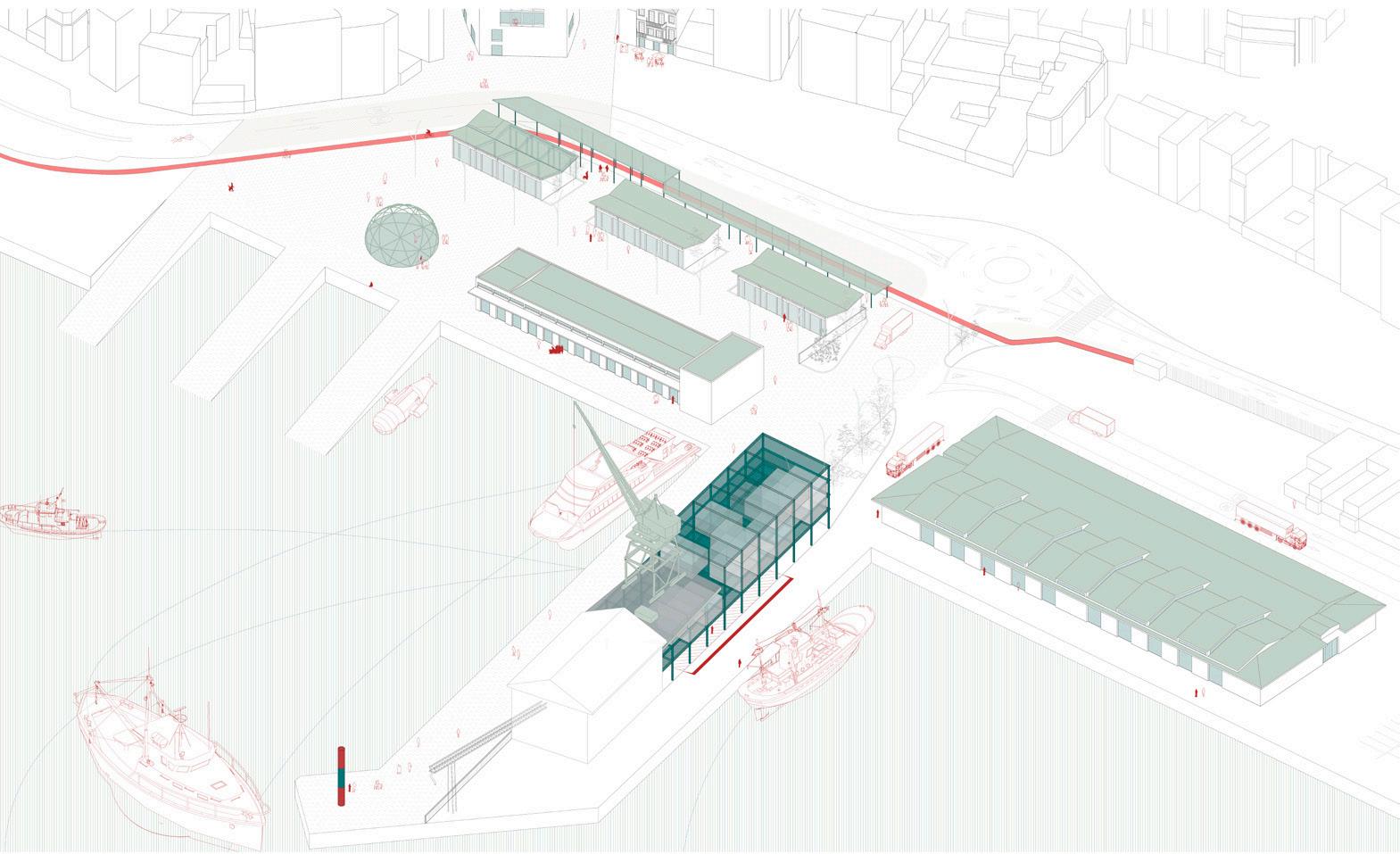 We propose a dual-use development incorporating both public and industrial functions. A series of significant sites will be restored, including the former fish market, while new structures will be erected to revitalize the area. The port is envisioned as the central axis for a pedestrian spine that traverses the study zones, supporting multiple public spaces and squares within the urban context