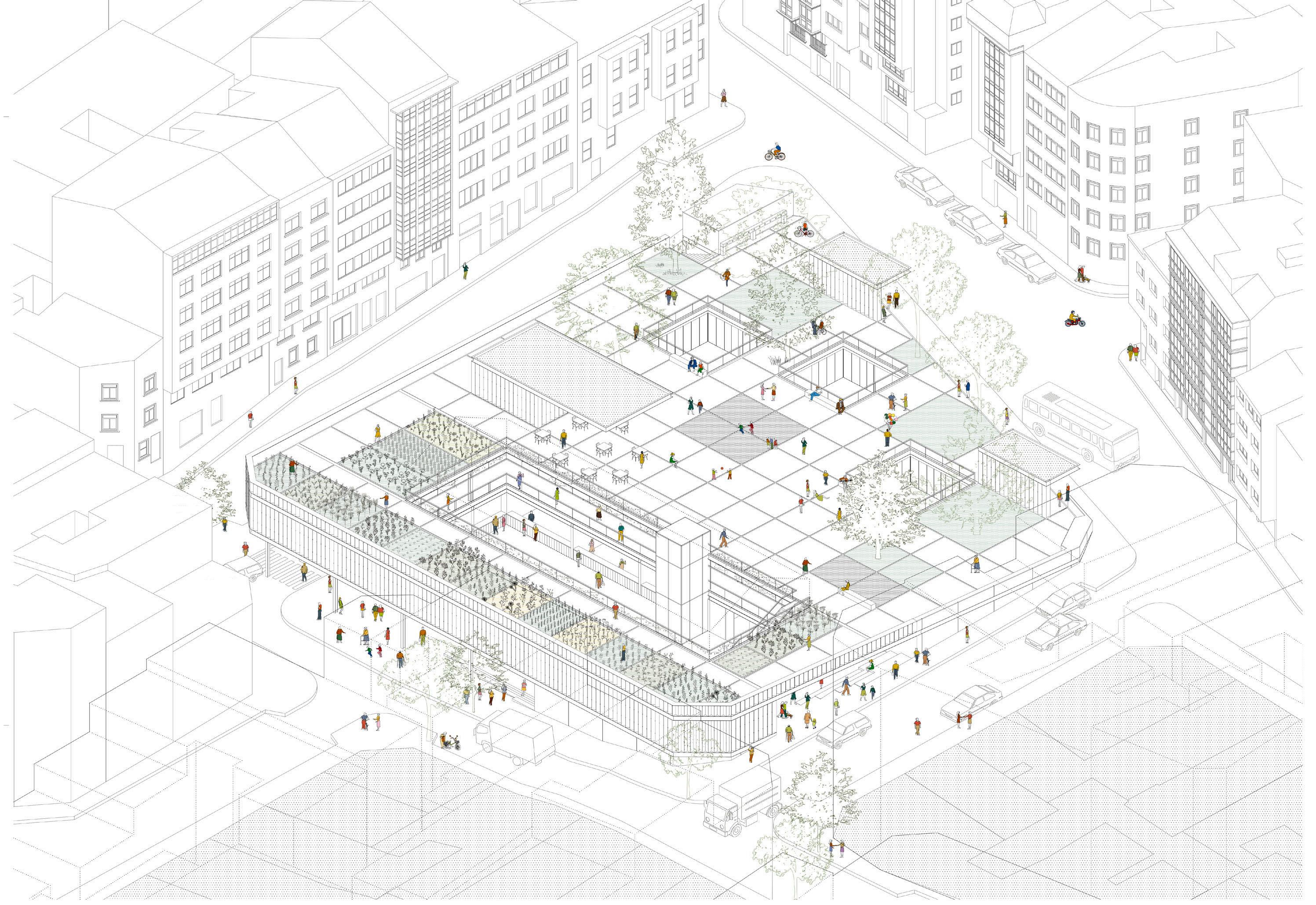 Action is taken to revitalize a deteriorated square. Concealed beneath it lies the municipal market. Our goal was to enhance the market’s visibility while addressing issues within the infant school, also hidden below the square. We introduced a series of courtyards to illuminate the lower level and connect it to the square. A green grid and urban vegetable gardens infuse the square with life and greenery.
