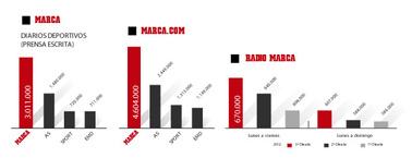 Apesar de esto, el diario también aventaja en lectores a la prensa de información general. Las cifras de El País (1.929.000), El Mundo (1.181.000), La Vanguardia (811.000), ABC (648.000), El Periódico (613.000) y La Razón (274.000) se sitúan por debajo de los tres millones de MARCA. En otro ámbito, el diario gratuito 20 Minutos (1.900.000) tampoco compite en número de lectores con nuestra cabecera deportiva.