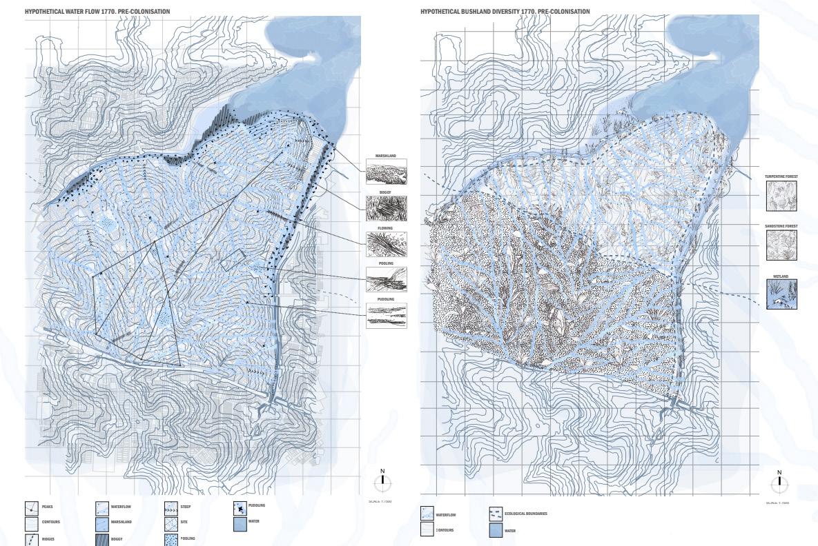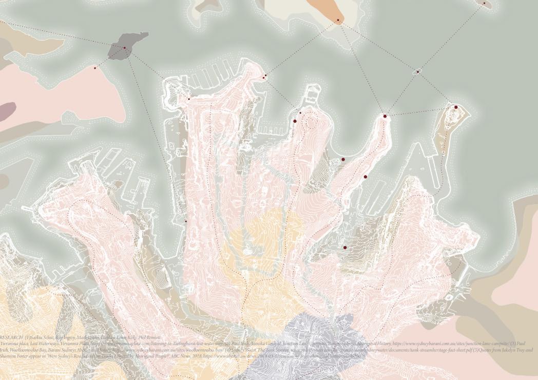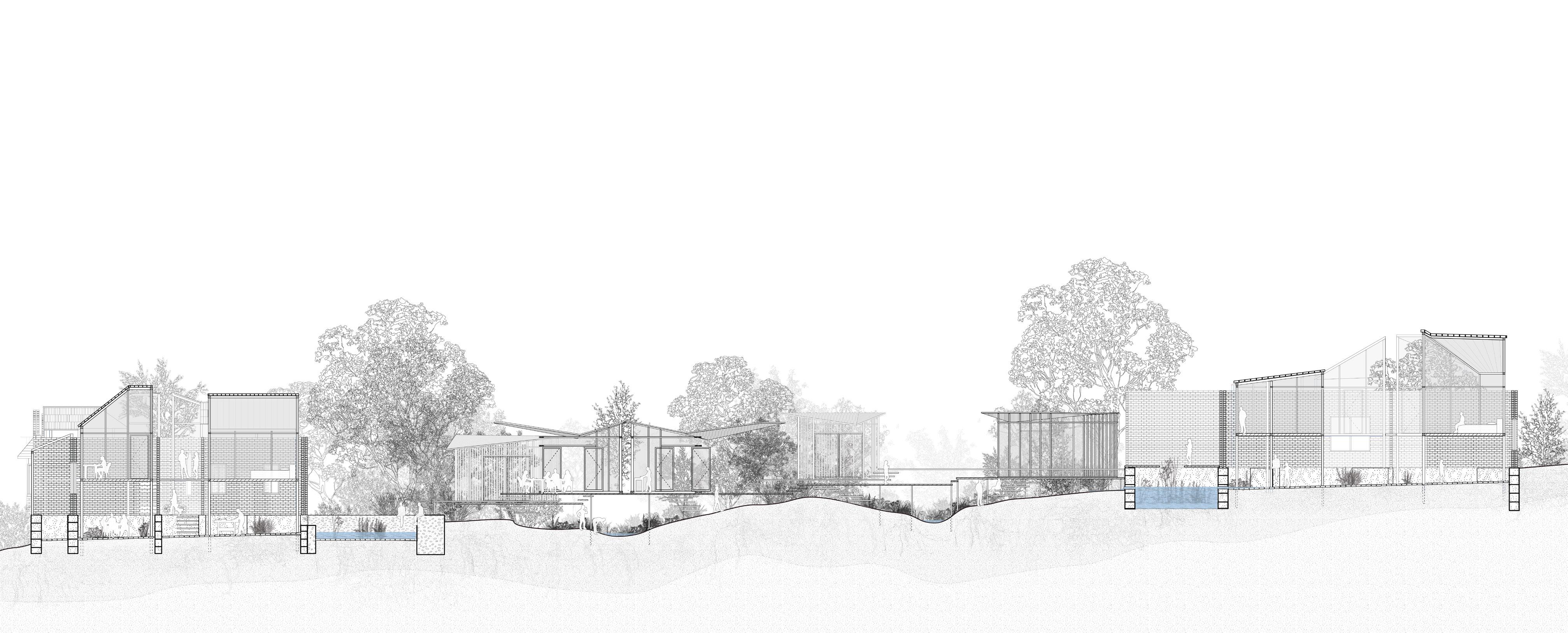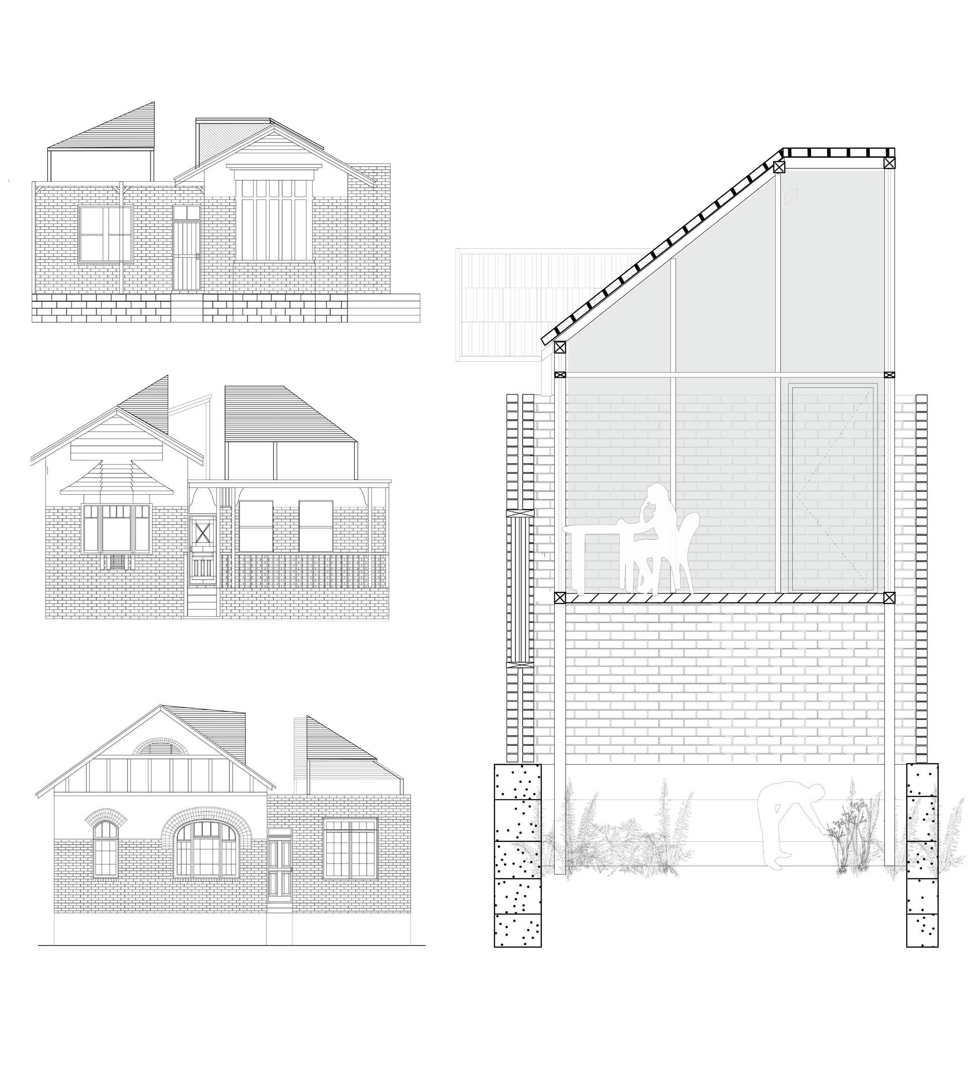 A speculative project in collaboration with a landscape architecture student. A response to colonial infrastructure and housing types, the project aims to both acknowledge and elevate natural systems over built heritage, while still allowing built heritage to co-exist with these systems. The project combines a macro landscape intervention of natural water management in the Haberfield area with a micro architectural intervention involving three Federation houses and their lots. The design responds to the re-introduction of a natural wetland and waterway system through the site by actively engaging with and using the water. Through adaptive re-use and infill of the houses, water is allowed to enter and sit within the structures, while liveable spaces are relocated to elevated rooms and pavilions throughout the site.