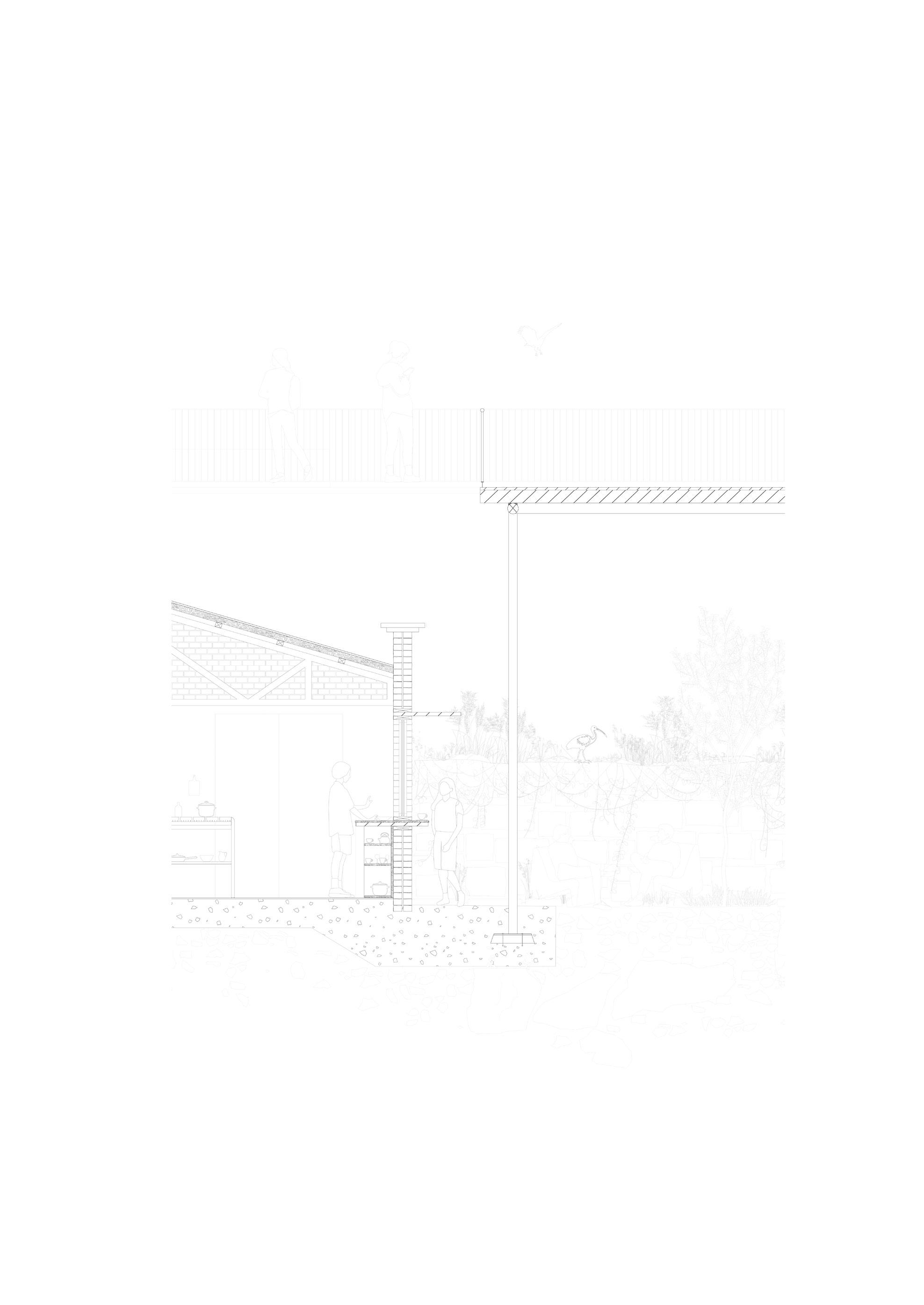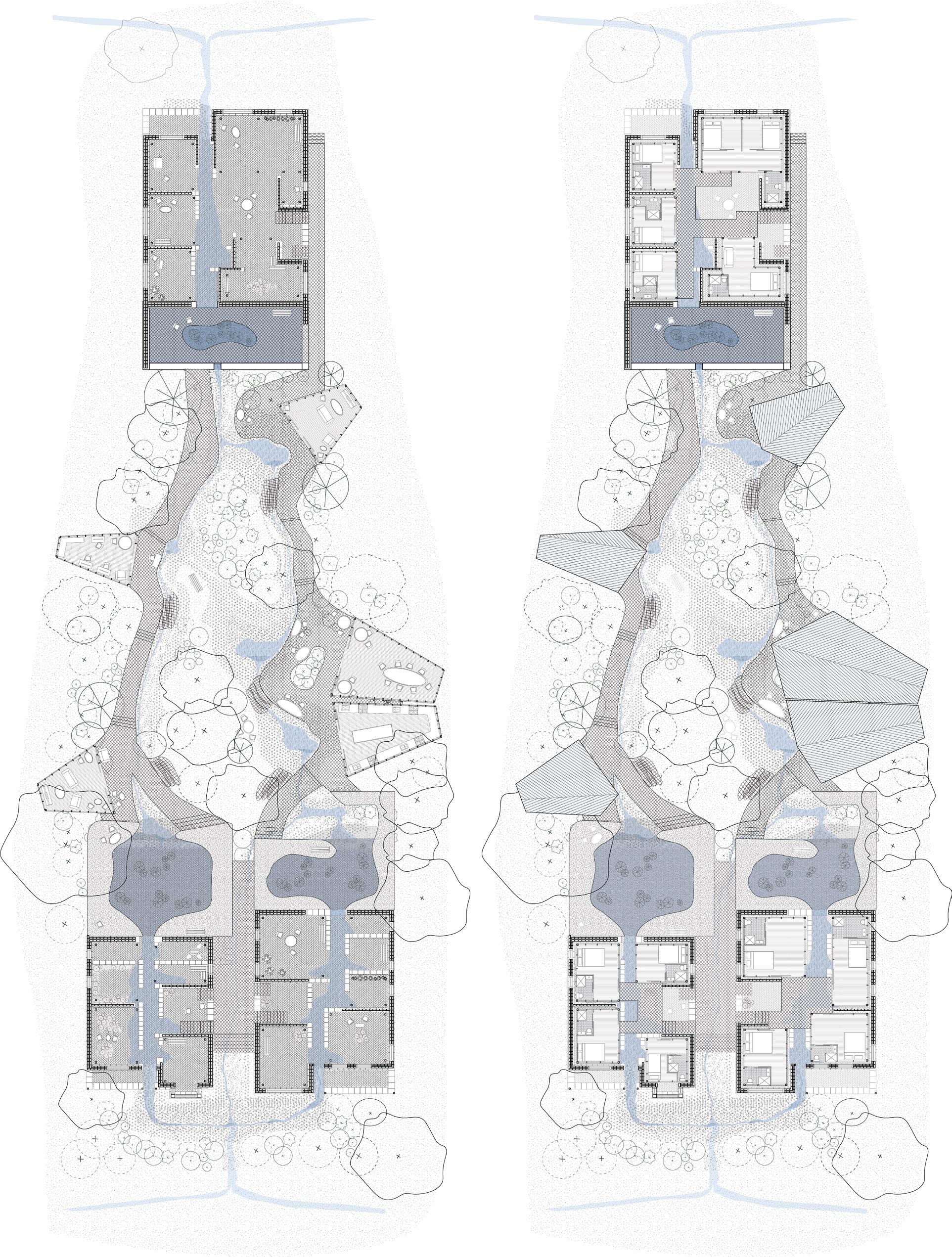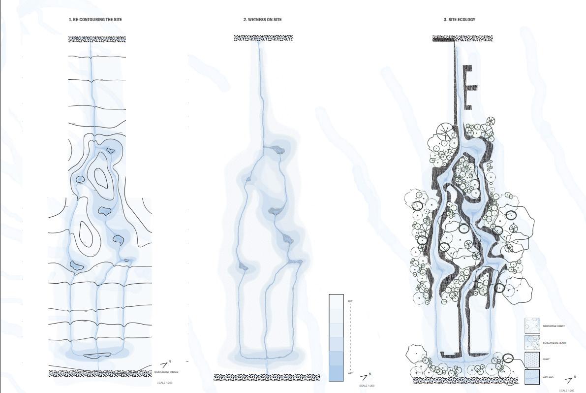 A speculative project in collaboration with a landscape architecture student. A response to colonial infrastructure and housing types, the project aims to both acknowledge and elevate natural systems over built heritage, while still allowing built heritage to co-exist with these systems. The project combines a macro landscape intervention of natural water management in the Haberfield area with a micro architectural intervention involving three Federation houses and their lots. The design responds to the re-introduction of a natural wetland and waterway system through the site by actively engaging with and using the water. Through adaptive re-use and infill of the houses, water is allowed to enter and sit within the structures, while liveable spaces are relocated to elevated rooms and pavilions throughout the site.