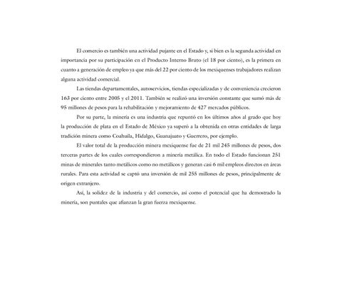 importancia por su participación en el Producto Interno Bruto (el 18 por ciento), es la primera en cuanto a generación de empleo ya que más del 22 por ciento de los mexiquenses trabajadores realizan alguna actividad comercial.