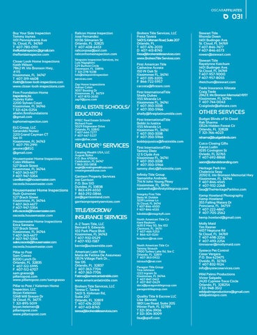 OTHER SERVICES Budget Blinds of St Cloud Rak Sharma 13526 Hidden Forest Cir Orlando, FL 32828 T 321-766-4023 rsharma@budgetblinds.com Cutco Closing Gifts Aaron Ludin 1035 Covington St Oviedo, FL 32765 T 407-692-8868 aaron@orlandobranding.com Heritage Park Inn Chalencia Seay 2050 E. Irlo Bronson Memorial Hwy Kissimmee, FL 34744 T 407-846-4545 F 407-932-2268 Sea@TheHeritageParkInn.com Kemp Howland Photography Kemp Howland 355 Falling Waters Dr Poinciana, FL 34759 T 407-222-4847 F 407-705-2562 kemp.howland@gmail.com Molly Maid Tim Rasner 4107 Neptune Rd St Cloud, FL 34769 T 407-498-2256 F 407-493-2254 timrasner@mollymaid.com Systeco Pet Control Cesar Vergara P.O. Box 623475 Oveido, FL 32765 T 407-832-9124 info@systecoservices.com Wild Palms Productions Victor Salgado 2420 Cypress Trace Circle Orlando, FL 328254 T 321-948-3512 wildpalmsproductions@gmail.com wildpalmspro.com