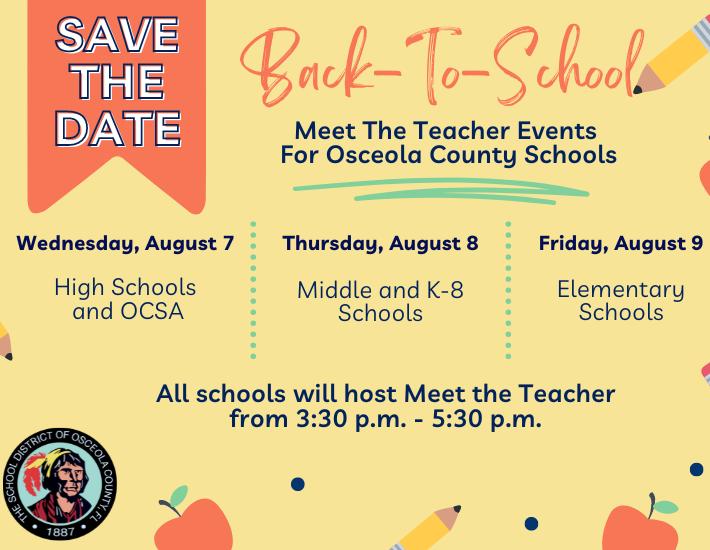 - Wednesday, August 7 - All high schools will host Meet The Teacher from 3:30 p.m. - 5:30 p.m. (including The Osceola County School for the Arts Grades 6-12)