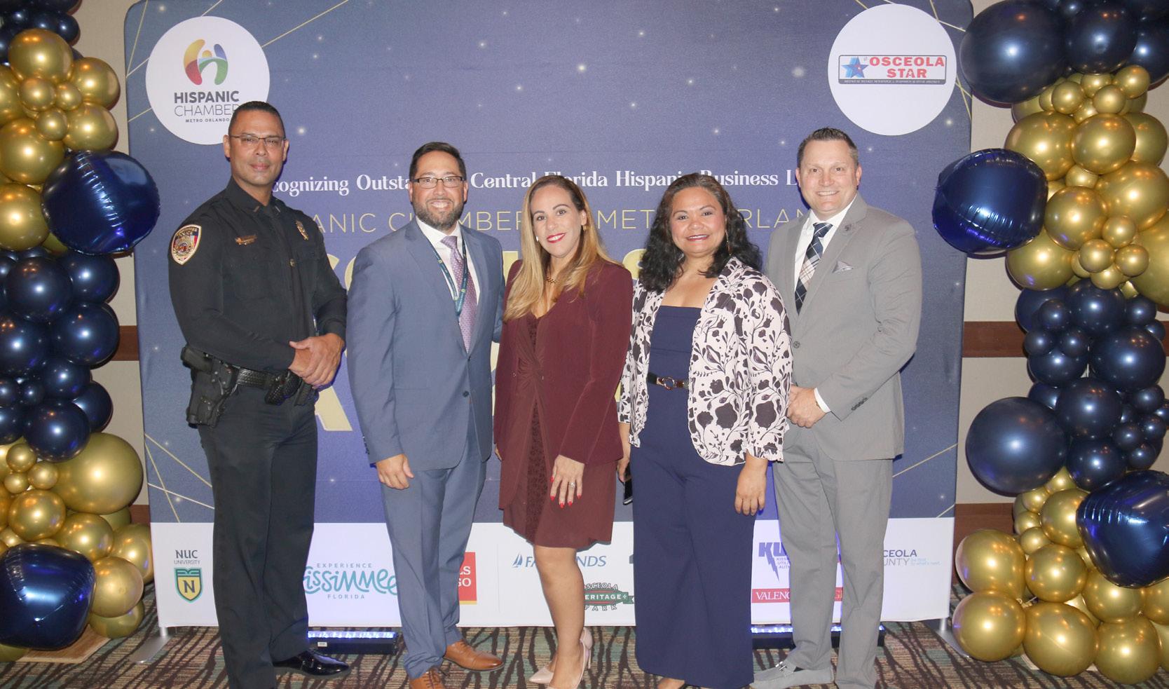 Pedro Turushina HCMO President, Hispanic Chamber of Metro Orlando Osceola Stars Awards honorees: Kissimmee Mayor Olga González, Osceola County Manager Don Fisher, Erica and Pete Veloz, Sergio and Odilia Alvarado, with Yanin Hansen, Osceola Star President.