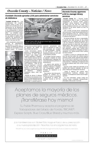 operación (actualmente siete días a la semana en cuatro de seis sucursales del condado) en todas localidades. Además, se les ofrecerán a todos los empleados posiciones con LSSI en sus salarios actuales. El Condado Osceola conserva la posesión completa de todas las instalaciones y materiales, así como las decisiones políticas y la administración. La votación para aprobar el contrato fue de los Comisionados Quiñones, Attkisson y Hawkins. Los Comisionados Harford y Arrington se opusieron a la aprobación. Para obtener más información, póngase en contacto con la Oficina de Alcance Comunitario e Información al Público del Condado Osceola al 407-7420100.