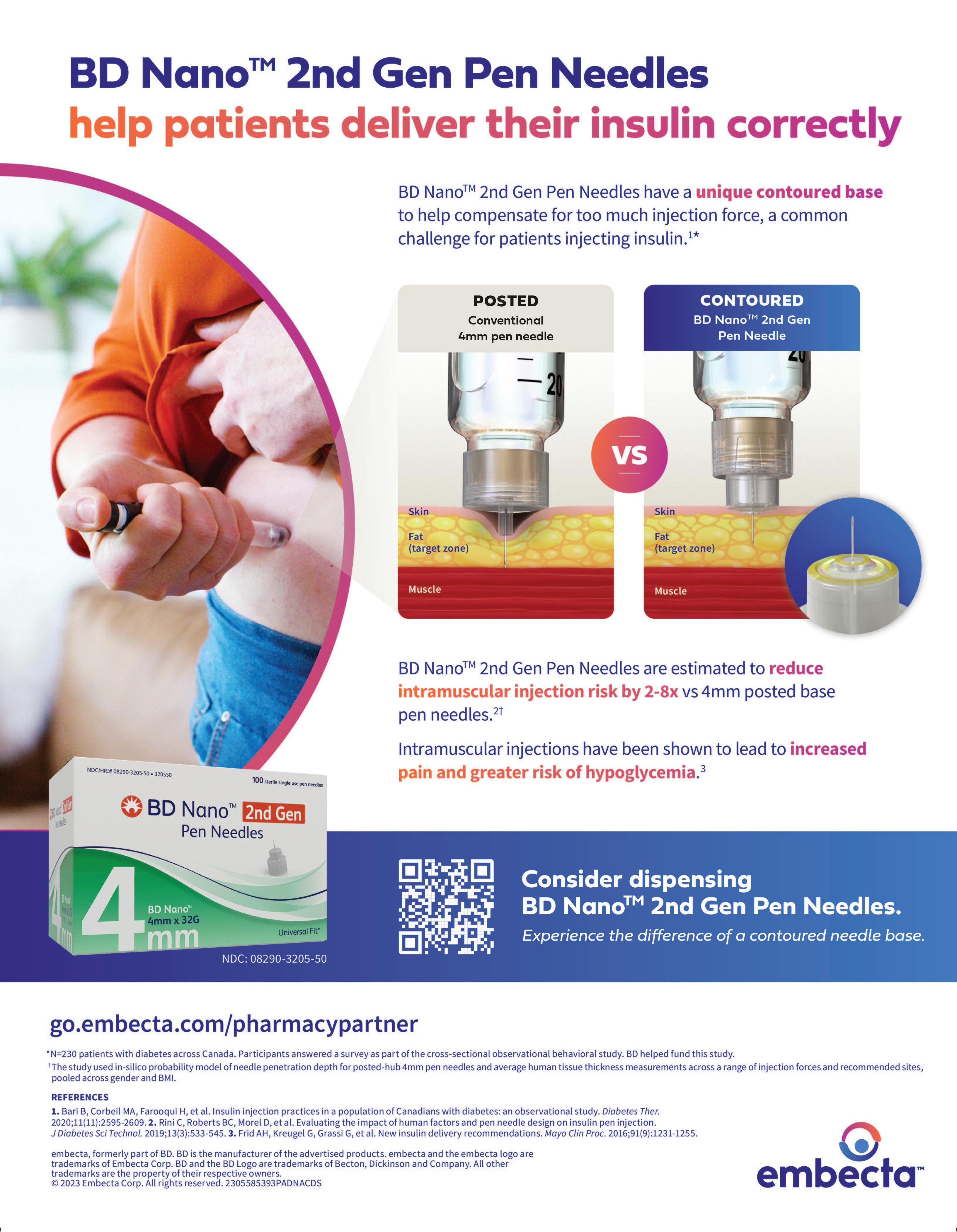 t o f o l l o w t h e l a t e s t p r o t o c o l s B u t healthcare providers are only one step in the healthcare continuum, and it’s important that those dispensing injection products also have a strong understanding of the benefits of shorter needles, injection site rotation and that n e e d l e s a r e i n d i c a t e d f o r s i n g l e - u s e only