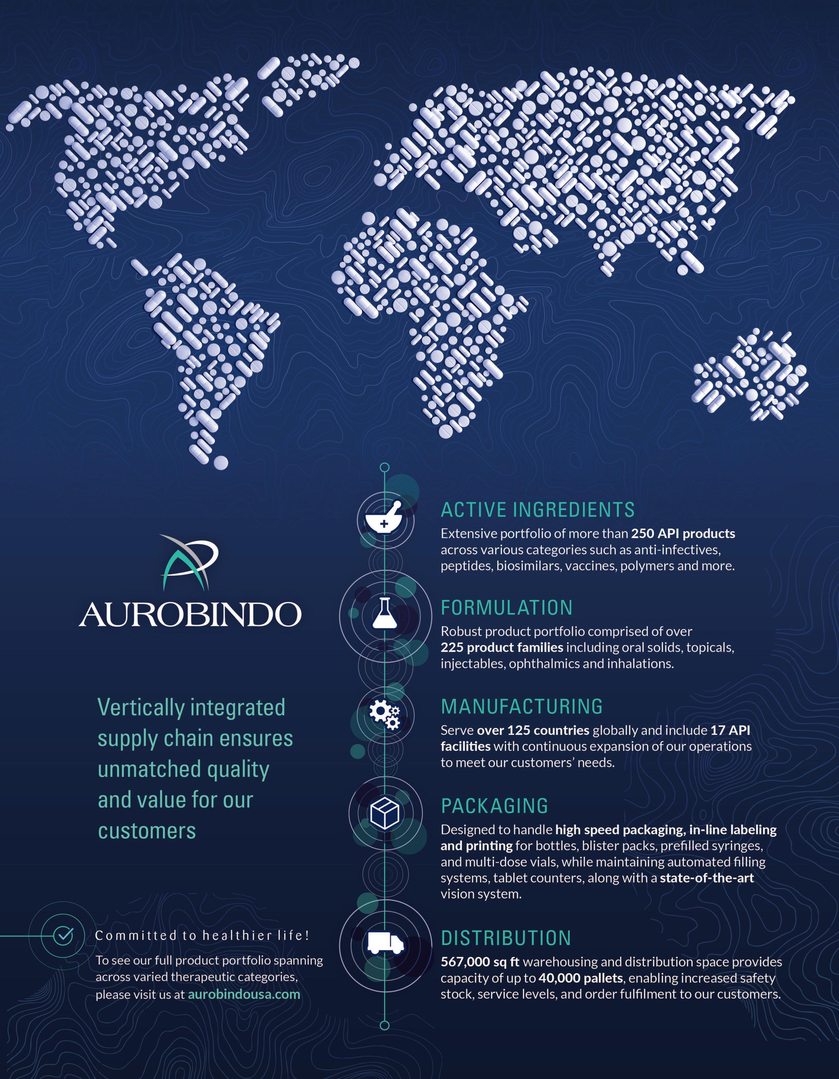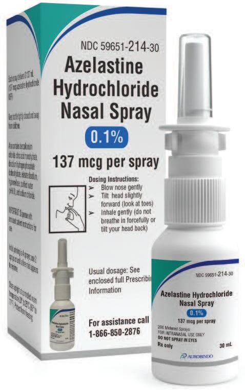 Azelastine Hydrochloride Nasal Spray 0 1% (137 mcg per spray) is Aurobindo’s first product launch in the United States utilizing a pump nasal spray delivery system. The development and launch of A z e l a s t i n e d e m o n s t r a t e s Aurobindo’s strategic push i n t o a l t e r n a t i v e d e l i v e r y systems, which in addition t o p u m p n a s a l s p r a y s i n c l u d e m e t e r e d d o s e inhalers, prefilled syringes and transdermal patches This is the company’s first nasal spray, indicated for the treatment of the symptoms of seasonal allergic rhinitis in adults and pediatric patients 5 years and older and for the treatment of the symptoms of vasomotor rhinitis in adults and adolescent patients 12 years and older