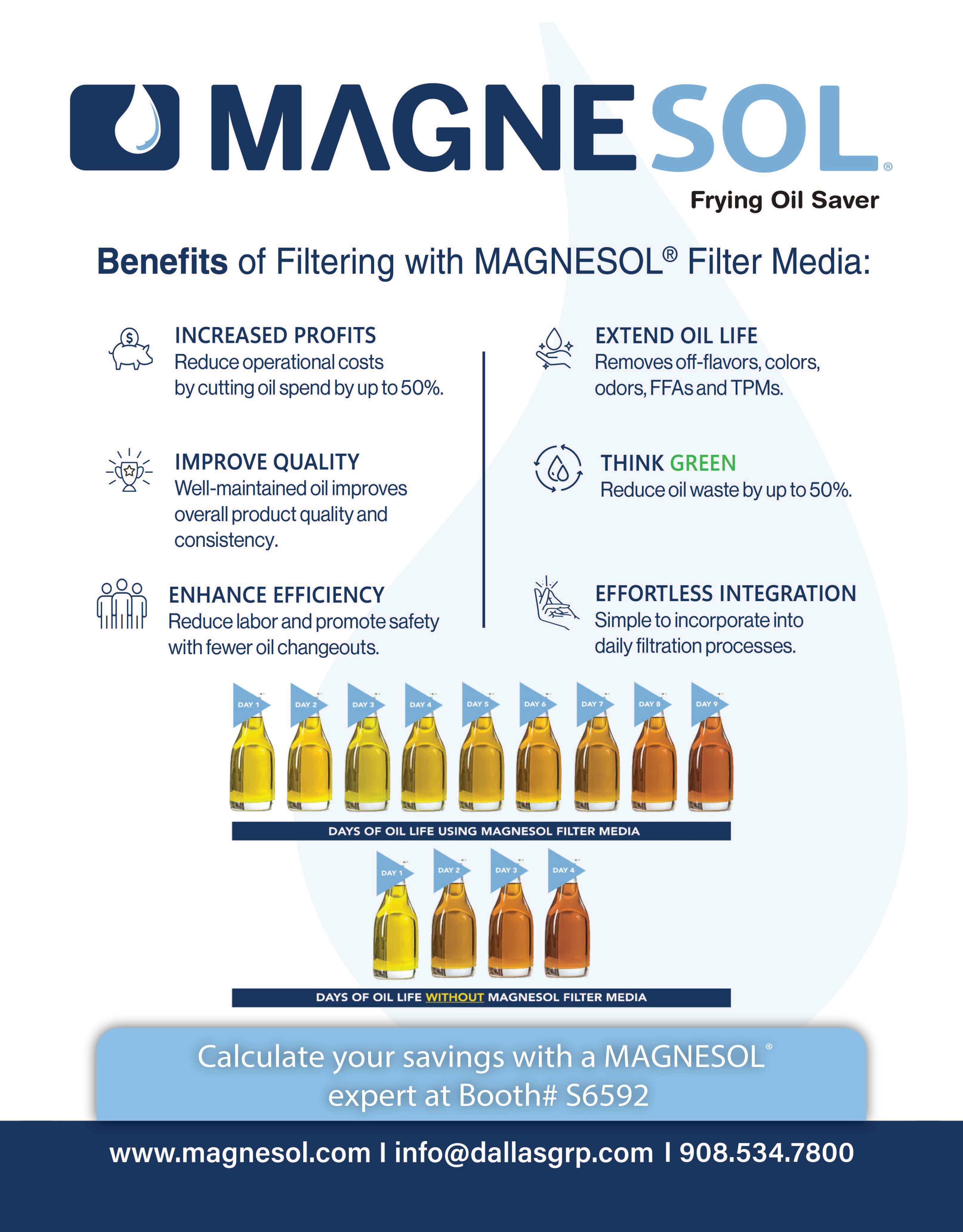 As the global leader in frying oil filtration, The Dallas Group manufactures Magnesol, a high-performance, pure-white adsorbent powder. It is fully food-grade and meets specifications set by the FDA, NSF and the World Health Organization’s JECFA Magnesol removes both solid and dissolved impurities from frying oil, improving the quality of fried foods and extending the usable life of the oil For restaurants, this means a potential increase in oil life by 30% to 50%, generating significant savings