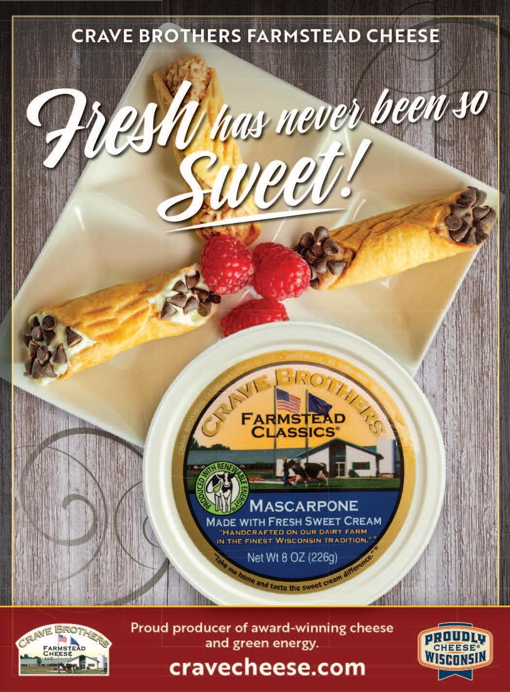 The couple founded Crave Brothers Farmstead Cheese in 2001 in partnership with George’s brothers – Charles, Mark and Tom Together with 13 family members and 50 dedicated employees, they grew the business into a nationally renowned brand producing awardwinning cheeses Last summer, for the second year in a row, Crave Brothers took W isconsin S t a t e F a i r ’s t o p t i t l e , G r a n d M a s t e r Cheesemaker, for its chocolate mascarpone that Brian Crave made