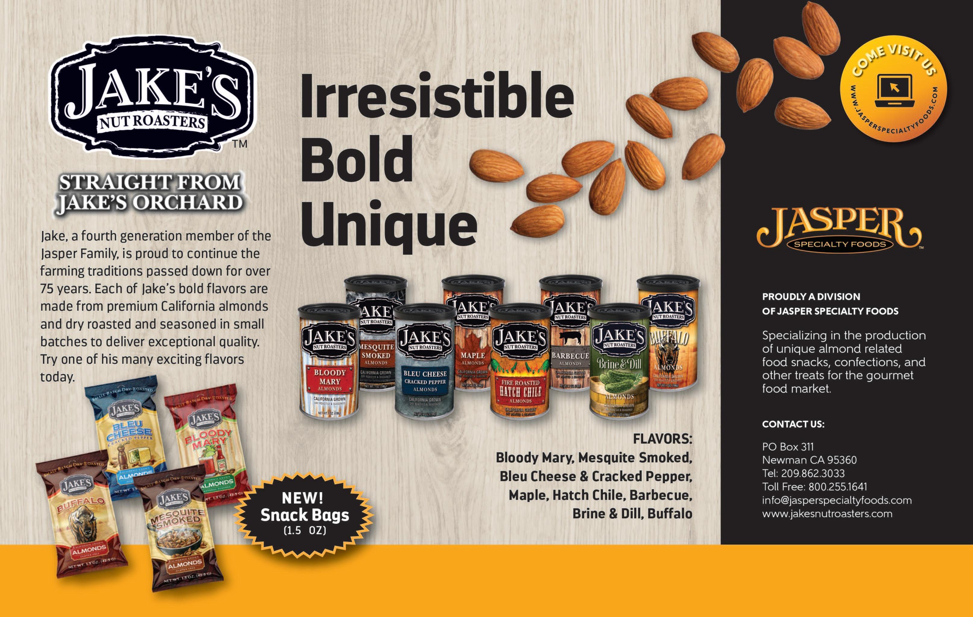 Jake, a fourth-generation member of the Jasper family, is proud to continue the farming traditions of his great-grandfather that have been passed down for over 75 years Jake’s Nut Roasters is pleased to announce its newest flavor to the Jake’s can lineup, Brine & Dill Almonds