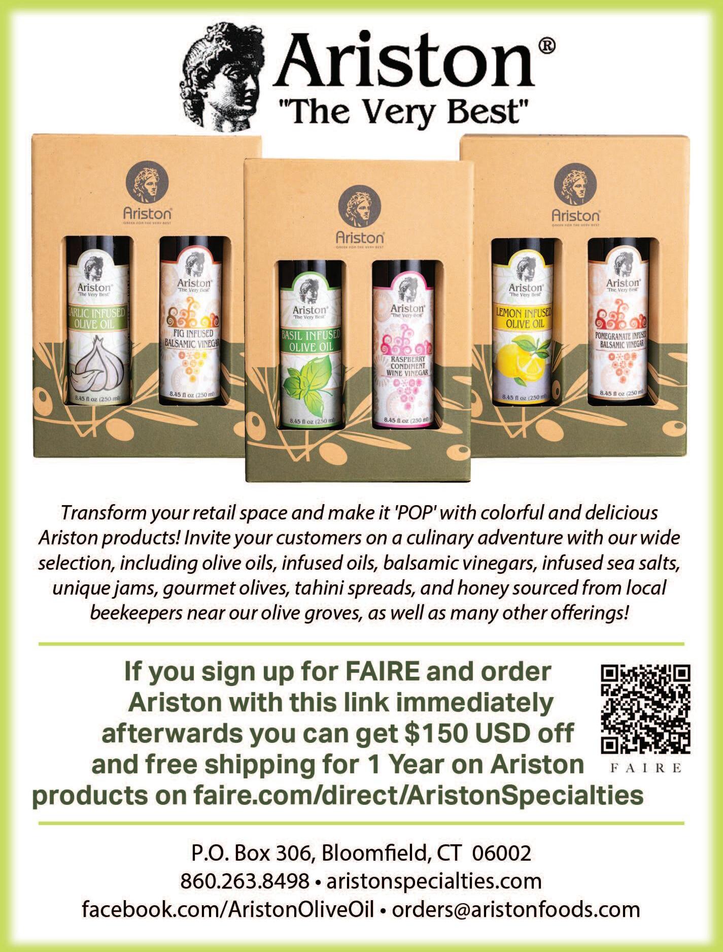 Order today to enhance your retail space with Ariston’s beautiful and colorful oils and vinegars, which are not only delicious, but also visually appealing Be sure to explore the wide range of products, including