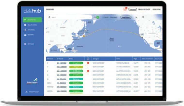 With the com p l i c a t i o n s , s u c h a s delays, that COVID brought to the sup ply chain, it is no surprise that Able’s customers want more visibility of their shipments’ status DataHub provides one stop, real time visibility of all the related documents of the customer’s shipments and allows for proactive res olutions and communications DataHub benefits include real time shipment status, dashboard with geolo cation of in flight shipments, can be dis played in five different languages, stan d a r d a n d c u s t o m i z a b l e r e p o r t s , c u s tomizable shipment event notifications