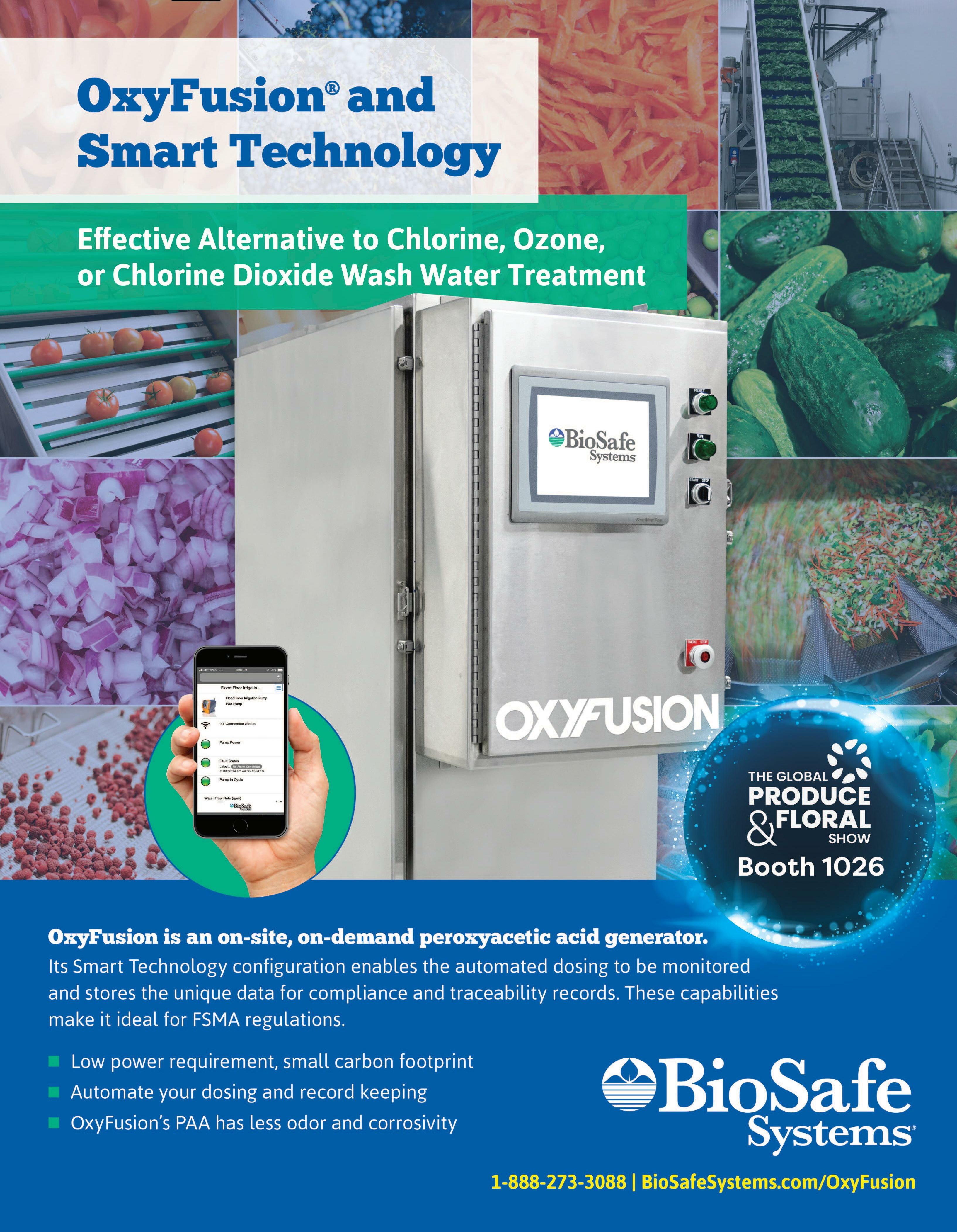 T h e F o o d S a f e t y M o d e r n i z a t i o n A c t (FSMA) increased safety measures to protect people from consuming con taminated food; wash water is a vulner able spot where cross contamination often happens. It’s as simple as rotten pathogens from one bad apple trans ferring to the next batch through the water According to a study conducted by the Food Marketing Institute (FMI) a n d t h e G r o c e r y M a n u f a c t u r e r s A s s o c i a t i o n ( G M A ) , f o o d r e c a l l s c o s t companies an average of $10 million p e r i n c i d e n t O x y F u s i o n ® w a s d e v e l oped to not only generate and dose p e r o x y a c e t i c a c i d o n s i t e , b u t w i t h Smart Technology to create reports that streamline the auditing processes to
