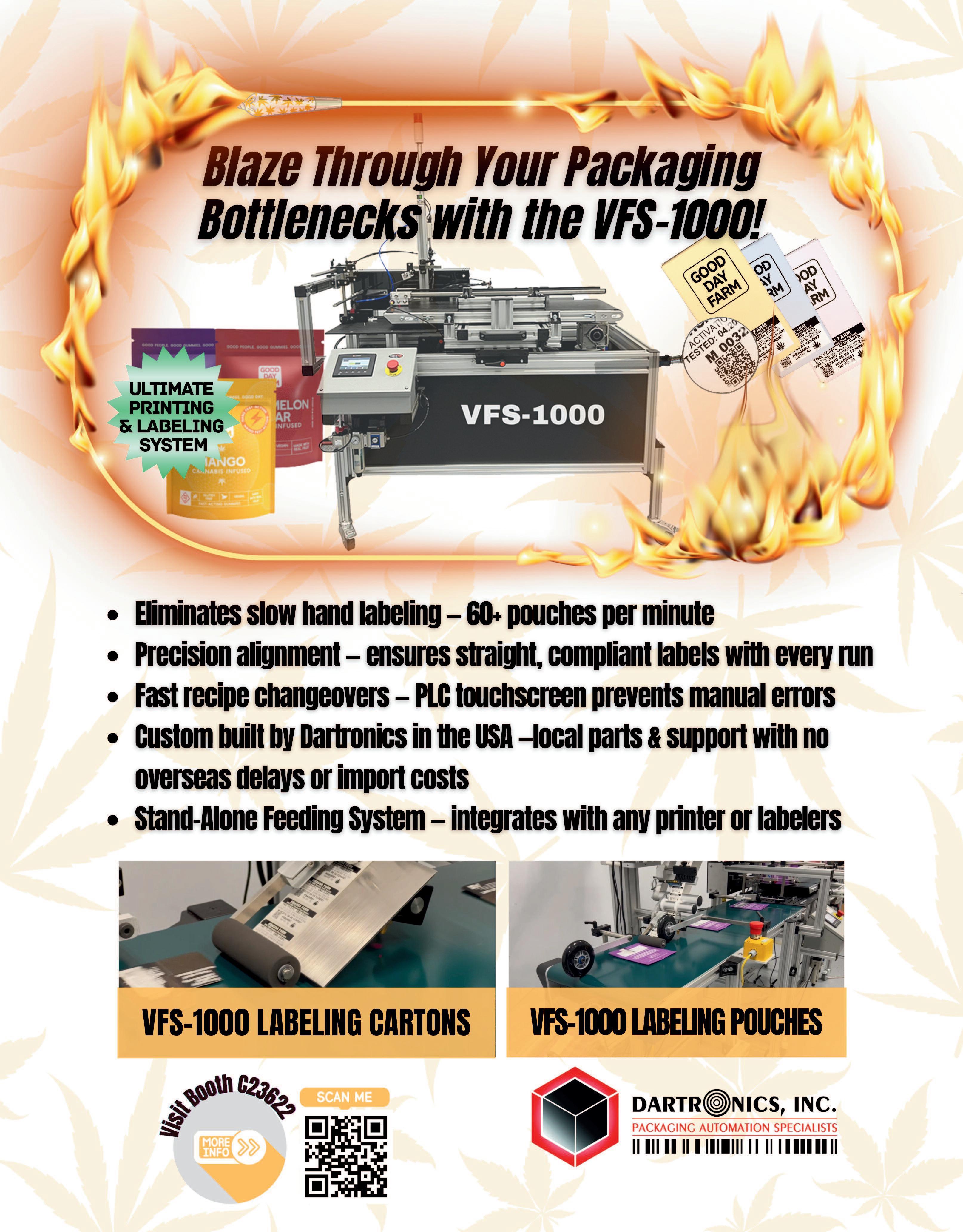 The VFS-1000 is designed to integrate seamlessly with any printer or labeling system, making it one of the most versatile feeding solutions in the cannabis packaging market. As a distributor, Dartronics helps match your operation with the perfect combination of hardware from the extensive catalog, ensuring every setup is built for your specific workflow. Whether you’re running flower, edibles, tinctures or concentrates, the VFS1000 adapts to your process, eliminating bottlenecks and simplifying your setup from day one