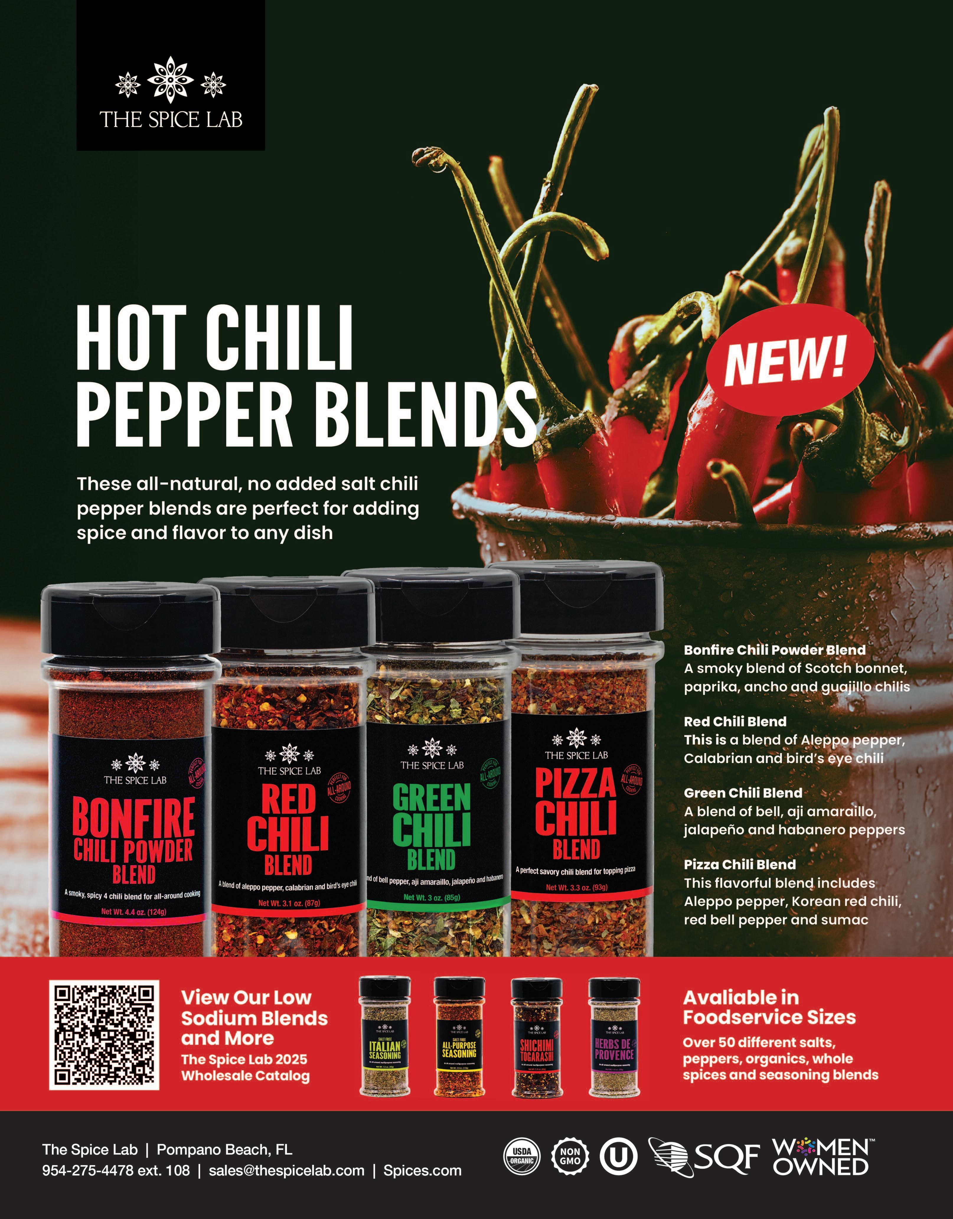eral new blends that are ver y low sodium and high in flavor Bonfire Blend is a fier y chili blend that includes ancho chili, guajillo chili and Scotch bonnet for heat and cumin, cocoa powder and oregano to provide depth and complexit y R ed Chili Blend simply contains three chilis: Aleppo, spic y Calabrian and bird’s eye chili The chilis add a burst of heat as well as fruit y citrusy notes Green Chili Blend gets its fire from green habanero and aji amarillo chilis and it is great stirred into a pot of pinto beans or cor nbread batter Pizza Blend is a fun, not too spic y blend that is inspired by the dusty chili shakers found on tables at pizza joints I t adds flavor and a mild touch of heat with ingredients such as Aleppo pepper, sumac, tomato, gar lic