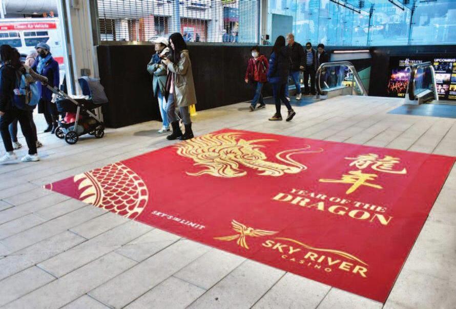 The extensive campaign features a l a r g e r - t h a n - l i f e v i d e o w a l l , l a r g e wallscape banner, floor graphics and digital platforms across all three metro stations The various creatives will continue to immerse commuters traveling to and from these stations with Sky River Casino’s offerings and messaging in the coming months The visual f e a t u r e s a r o a r i n g g o l d e n d r a g o n a g a i n s t e a r t h t o n e b a c k g r o u n d s T h e