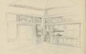 Other material in the archives of the Oak Spring Garden Foundation reveals that much work and discussion was necessary before the final design was approved. In particular, there is a small threedimensional paper model in pencil, watercolor, and body color with a proposal for the decoration of the greenhouse vestibule, which now depicts shelves crowded with a variety of objects. Attached to it is a maquette for the ceiling decoration. 85 The color scheme for the cabinets remained the warm, yellowish-brown tone of Renard’s first project, while the domed ceiling (embellished with the same bamboo motif) was tinted a pleasing pale blue-green, the background color that Bunny finally chose for the room. Recently, another eight sketches have come to light in which the artist and patron were clearly working out the grouping of the objects and the sequence of the panels, compositional solutions which, however, were not all incorporated into the final design. They provide a fascinating insight into the creative process and the close collaboration that led to the final result one can see today. 86