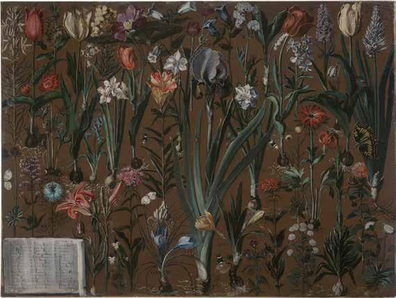 Among the noteworthy botanical paintings in the Oak Spring Garden Library collection are two large canvases by the Tuscan artist Gerolamo Pini (fl. ca. 1614–15), which represent replicas by the artist’s hand of two of the three paintings conserved in the Musée des Arts Décoratifs in Paris. These five paintings are the only known works by the artist to have come down to us. One portrays forty-three exotic flowering plants, mostly bulbous species, surrounding an imposing Iris susiana. In the other, seventy-one different species are arranged around a large Fritillaria imperialis. All of the plants are depicted with great fidelity, in most cases with their bulb, while their brightly colored flowers stand out against the dark brown background of the canvas. In the lower left corner of each painting is a partially unrolled trompe l’oeil scroll that is held in place by two trompe l’oeil pins. On each are listed the names of the plants depicted in the painting, followed by the signature of the artist and, in the painting featuring the iris, the date 1614. In addition, to heighten the impression of verisimilitude, the Tuscan artist has added a humorous detail familiar to us from the tradition of trompe l’oeil painting—a tiny fly that has alighted on the cartouche in the painting with the fritillary, almost inviting the viewer to swat it. 51